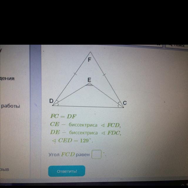 Обозначим углы при основании тр-ка DEF через х,тогда х=180-129 /2=51/2, и значит <FDC=<FCD=2x=51, <DFC=180-2*51=180-102=78
