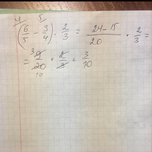 6*4/20 - 3*5/20 = 24/20 - 15/20 = 9/20