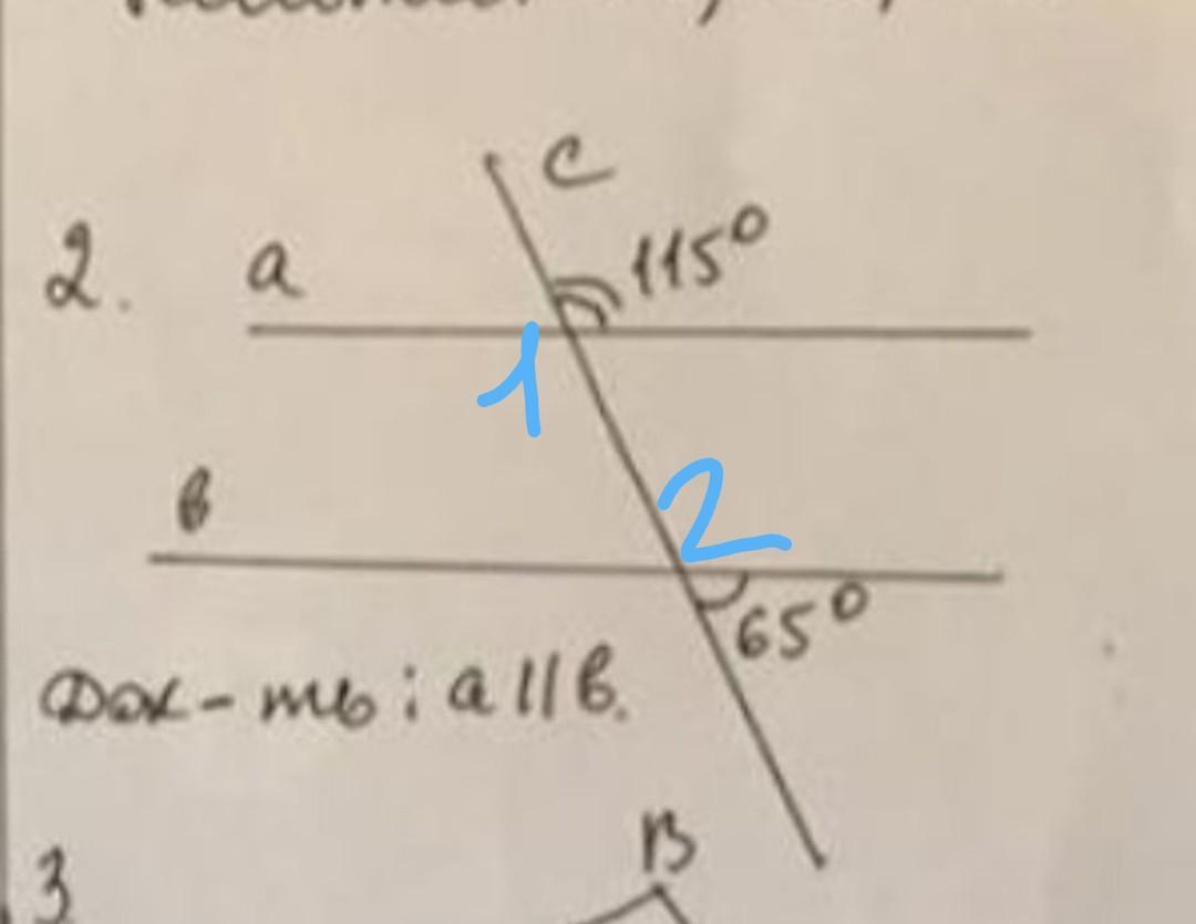 2) угол 1 = углу 2 ( 115°). Они накрест лежащие, а значит прямые параллельны.