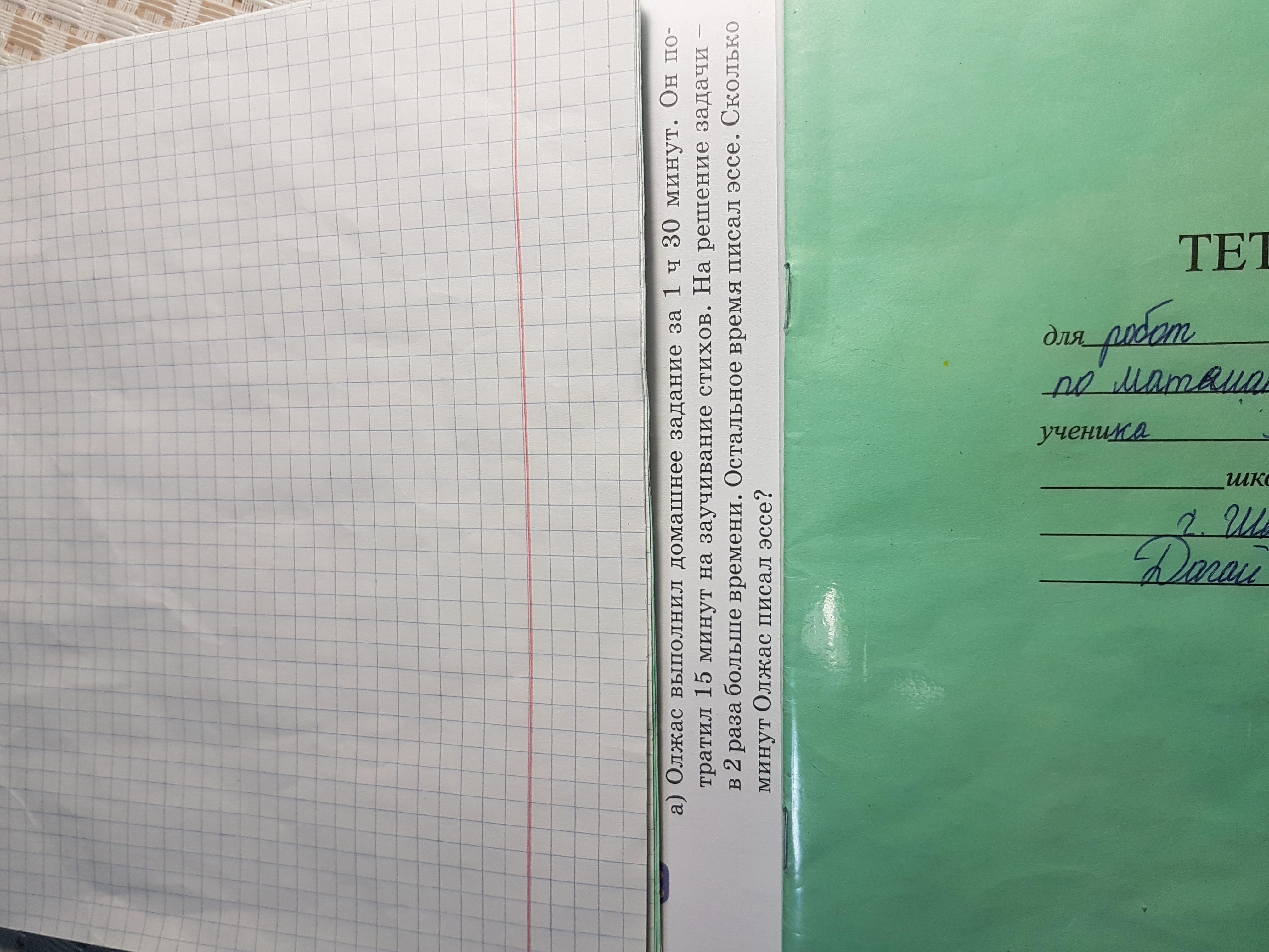 Олжас выполнил домашнее задание за 1 час 30 минут.он потратил 15 минут на заучивание стихов. На решение задачи в 2раза больше времени. Остальное время писала с сколько минут Олжас писал эссе?