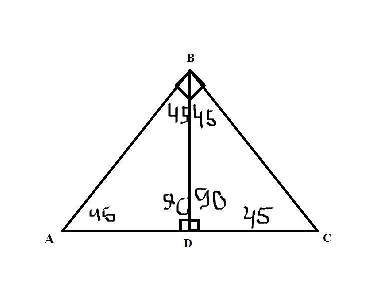 является и высотой и медианой.По условию биссектриса прямого угла разделила этот угол пополам: 90°:2=45° .