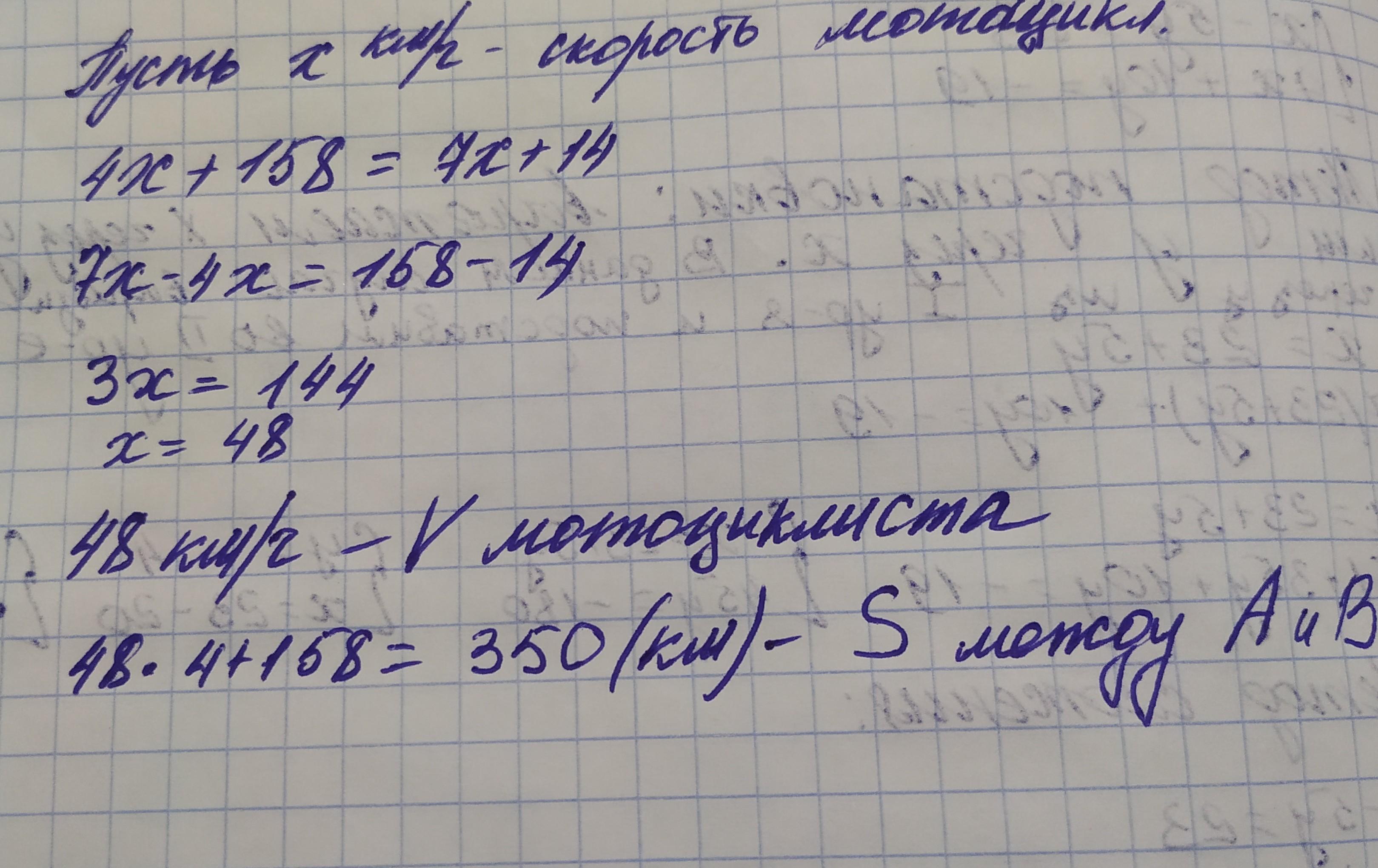 Если бы мотоциклист ехал в течение 4 ч. с постоянной скоростью, то до пункта B ему оставалось бы ещё проехать 158км. Если же мотоциклист ехал бы с такой же скоростью в течение 7 часов, то до пункта B ему оставалось бы ещё проехать 14 км. Определите вначале скорость движения мотоциклиста, а затем- расстояние от А до B