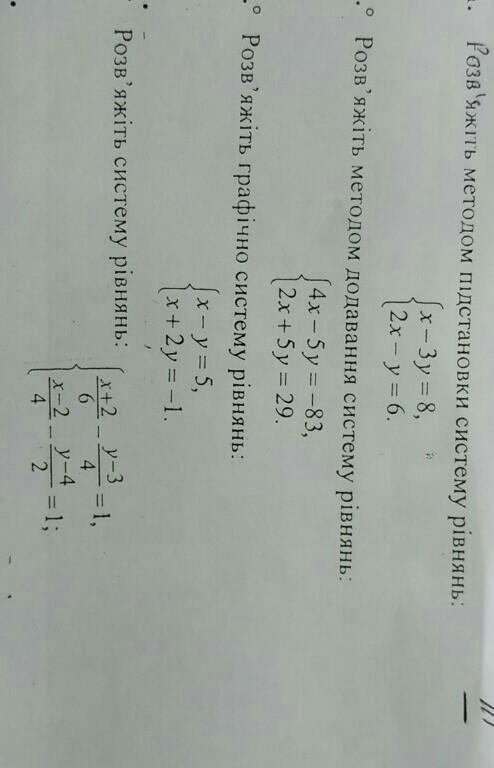 в 3 вырази з каждого уравнения иксы, подставь точки и построй две линии,ответы это точки их пересечения