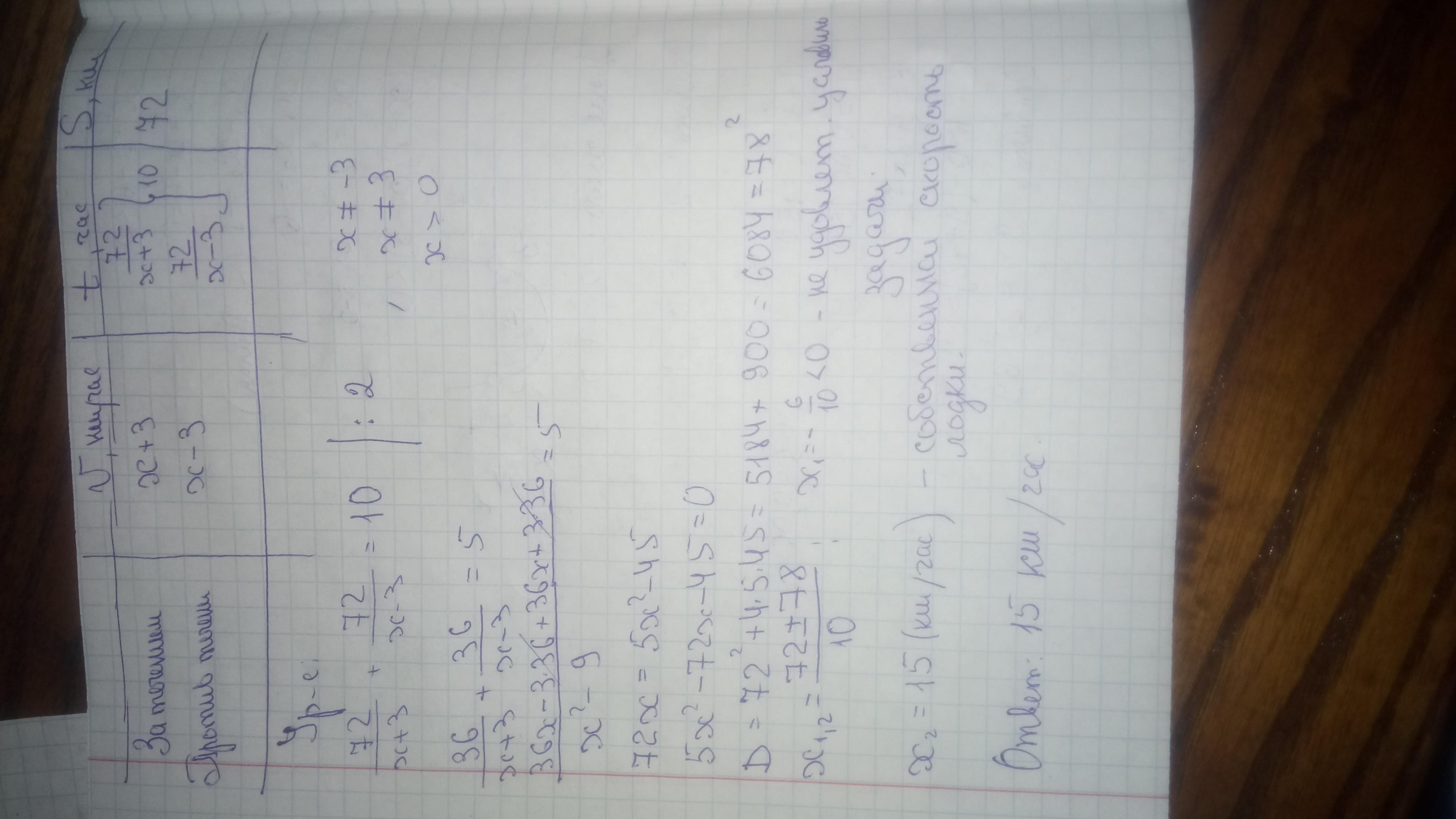 пусть х км/ч - собственная скорость лодки, тогда скорость по течению (х+3) км/ч, а против течения - (х-3) км/ч. Время в пути по течению 72/(х+3), а против - 72/(х-3), общее время равно 10 часов, значит:
