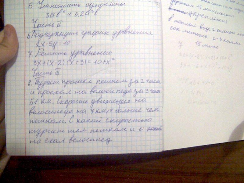 5.Турист прошёл пешком за 2 часа,и проехал на велосипеде за 3 часа 51км.Скорость движения на велосипеде на 7 км/ч больше чем пешком.С какой скоростью турист шел пешком и с какой на ехал велосипед.