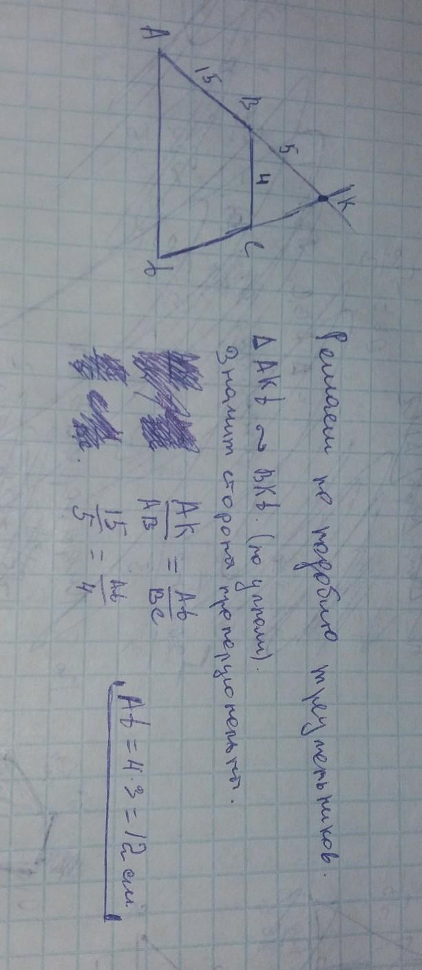 Продолжения боковых сторон AB и CD трапеции АВСD пересекаются в точке К. Меньшее основание BC равно 4 см, ВК= 5 см АВ= 15 см. Найти большее основание трапеции.