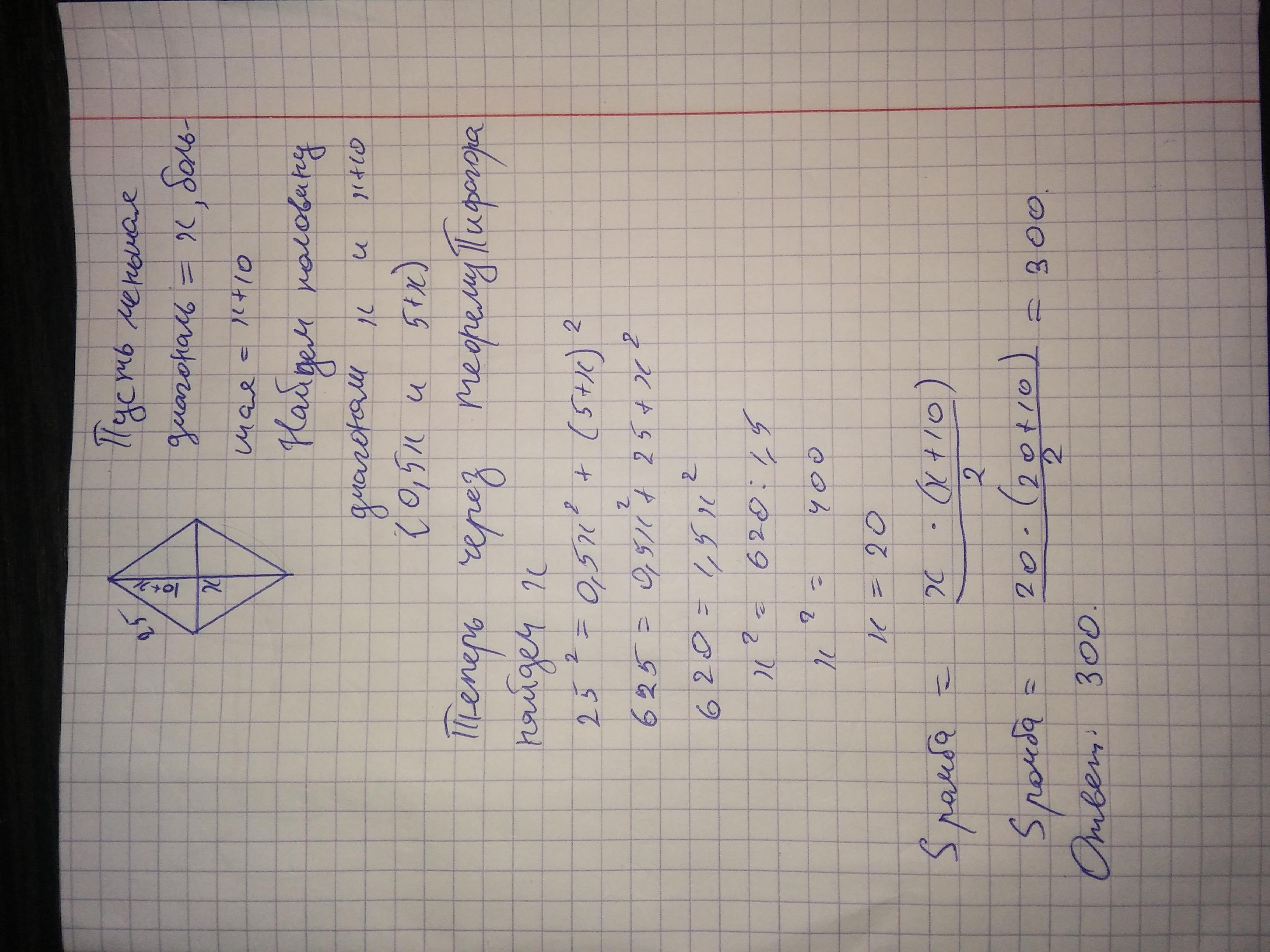 Одна из диагоналей ромба на 10 см больше, чем другая. Сторона ромба = 25 см. Найти площадь ромба.