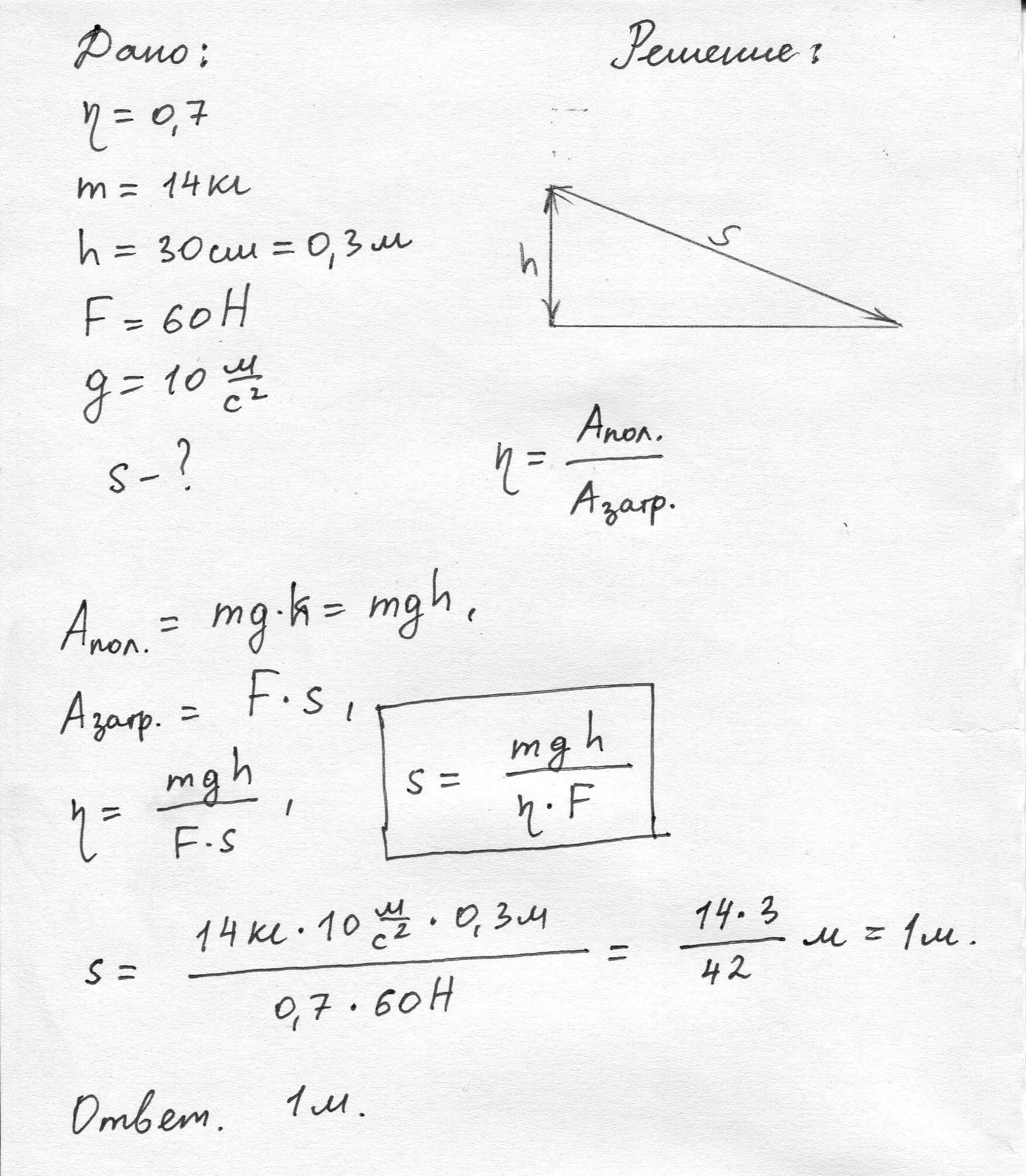 КПД наклонной плоскости составляет 70% . Что бы поднять по ней груз массой 14 кг , необходимо приложить силу 60Н . Какова длина наклонной плоскости , если ее высота равна 30 см.