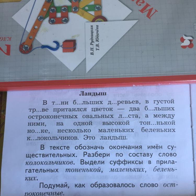 Ещё: В тени (☐и) больших деревьев (☐ев), в густой траве (☐е) притаился цветок☐ (нулевое окончание) - два больших остроконечных овальных листа (☐а), а между ними, на одной высокой тоненькой ножке (☐е), несколько маленьких беленьких колокольчиков (☐ов). Это ландыш☐ (нулевое окончание).