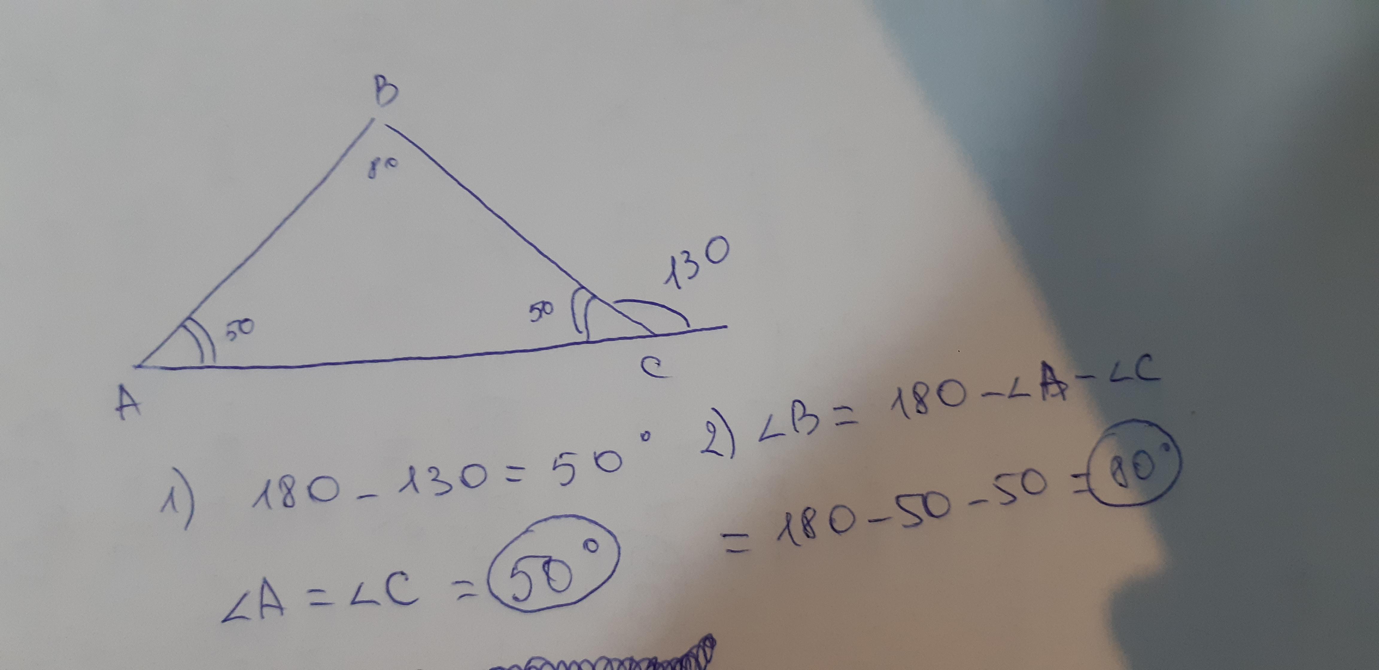 Внешний угол при основании равнобедренного треугольника равен 130° градусам. Найдите углы треугольника