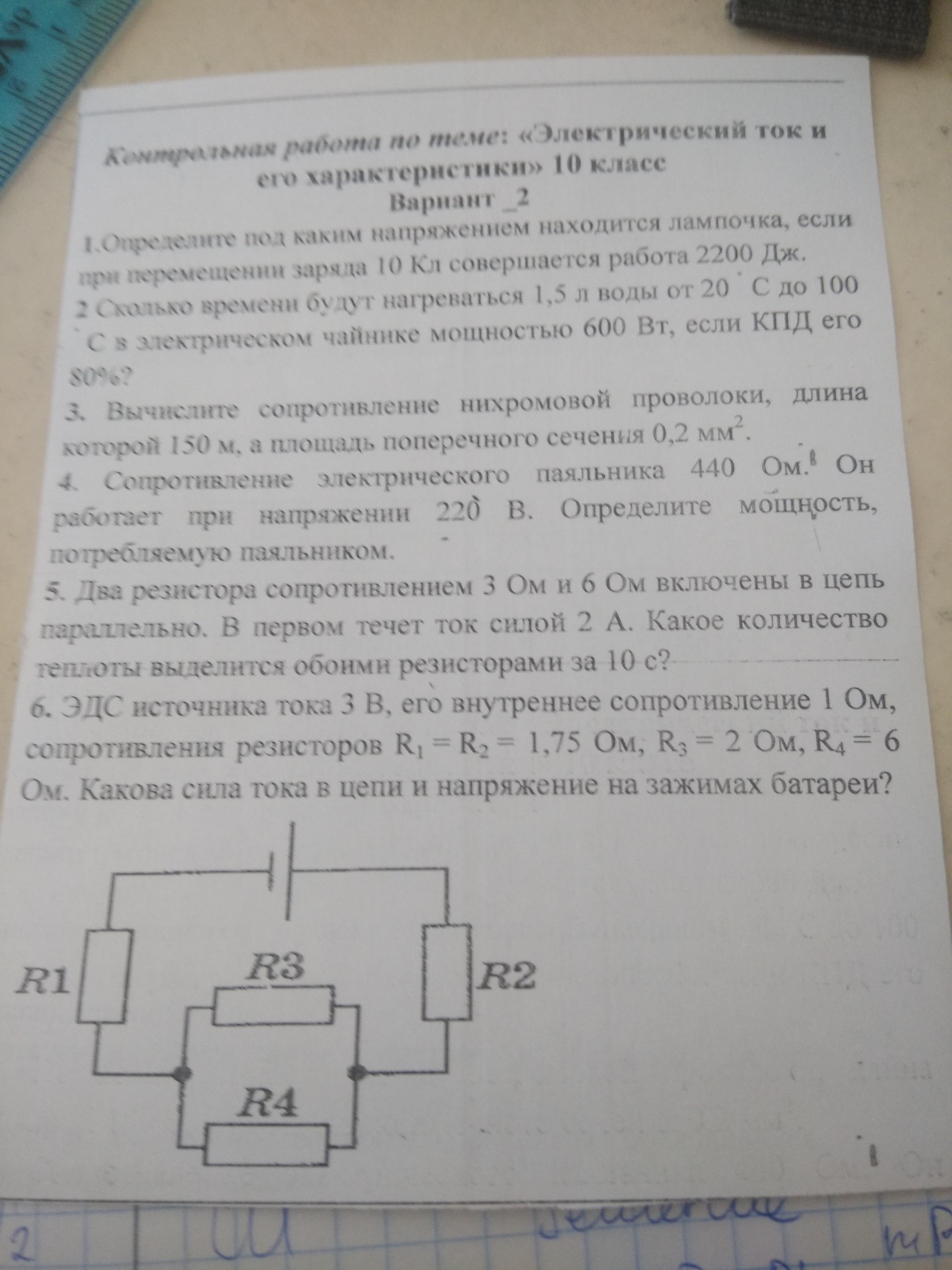 ЭДС источника тока 3В, его внутреннее сопротивление 1Ом, сопротивление регистров R1=R2=1,75 Ом, R3=2 Ом, R4=6 Ом. Какова сила тока и напряжение на звжимах батареи