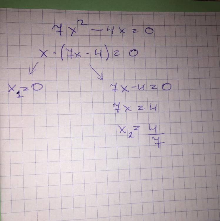 Х(7х-4)=0 Х1=0 7х-4=0