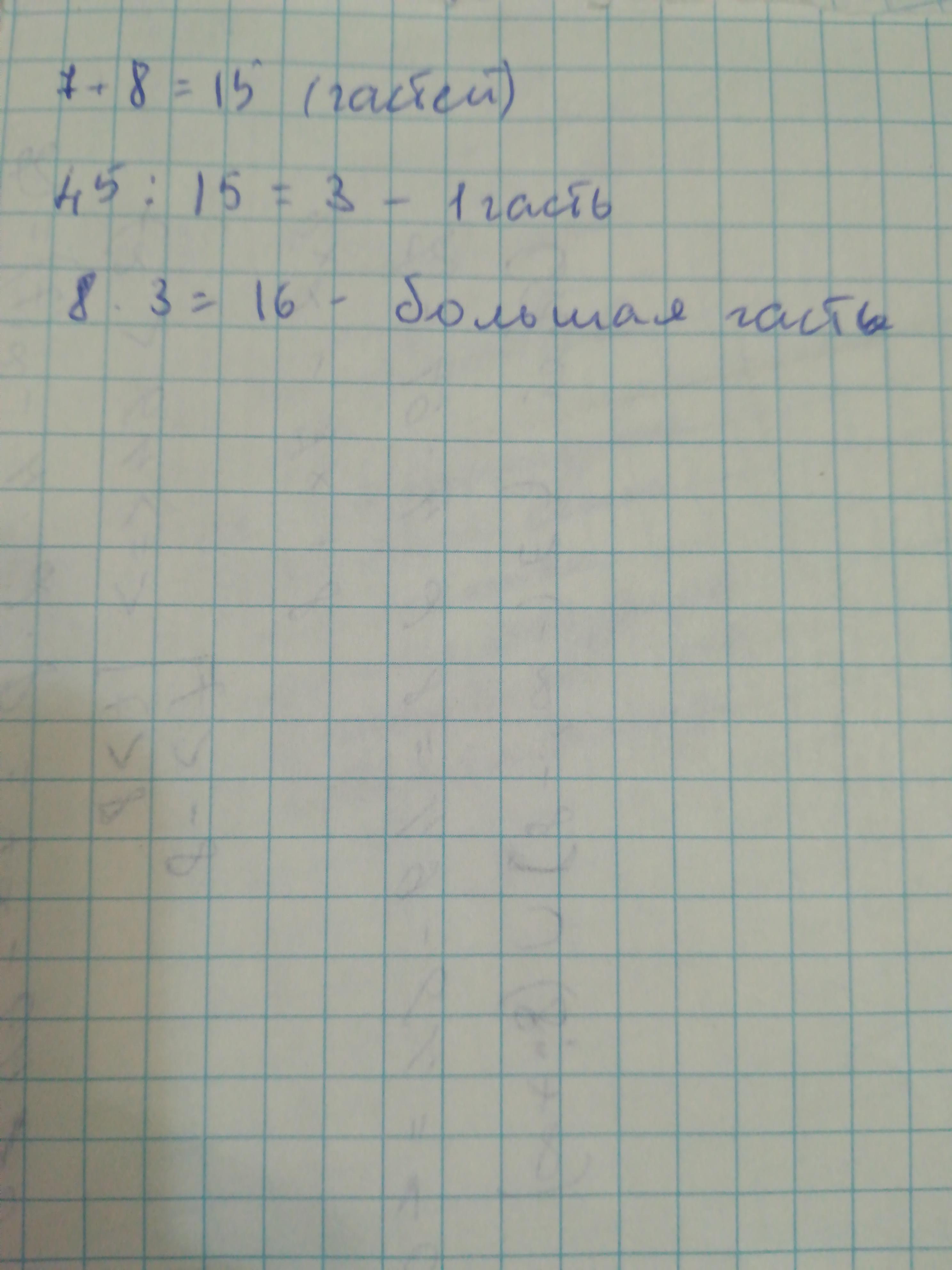 Пошаговое объяснение: колво частей. Потом общее делим на колво частей. И умножаем одну часть на 8 (большую)