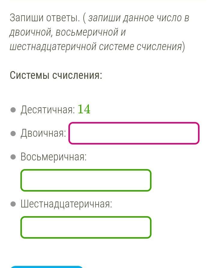 Запиши ответы. ( запиши данное число в двоичной, восьмеричной и шестнадцатеричной системе счисления)