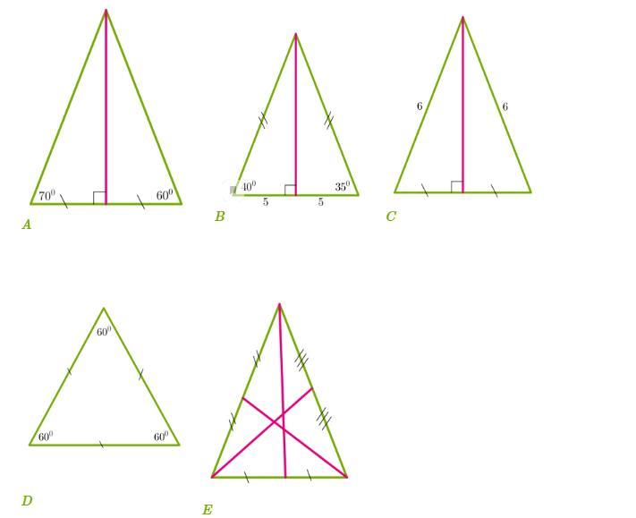 Даны рисунки пяти треугольников, на которых дана некоторая информация об углах и отрезках. На которых рисунках информация дана правильно?