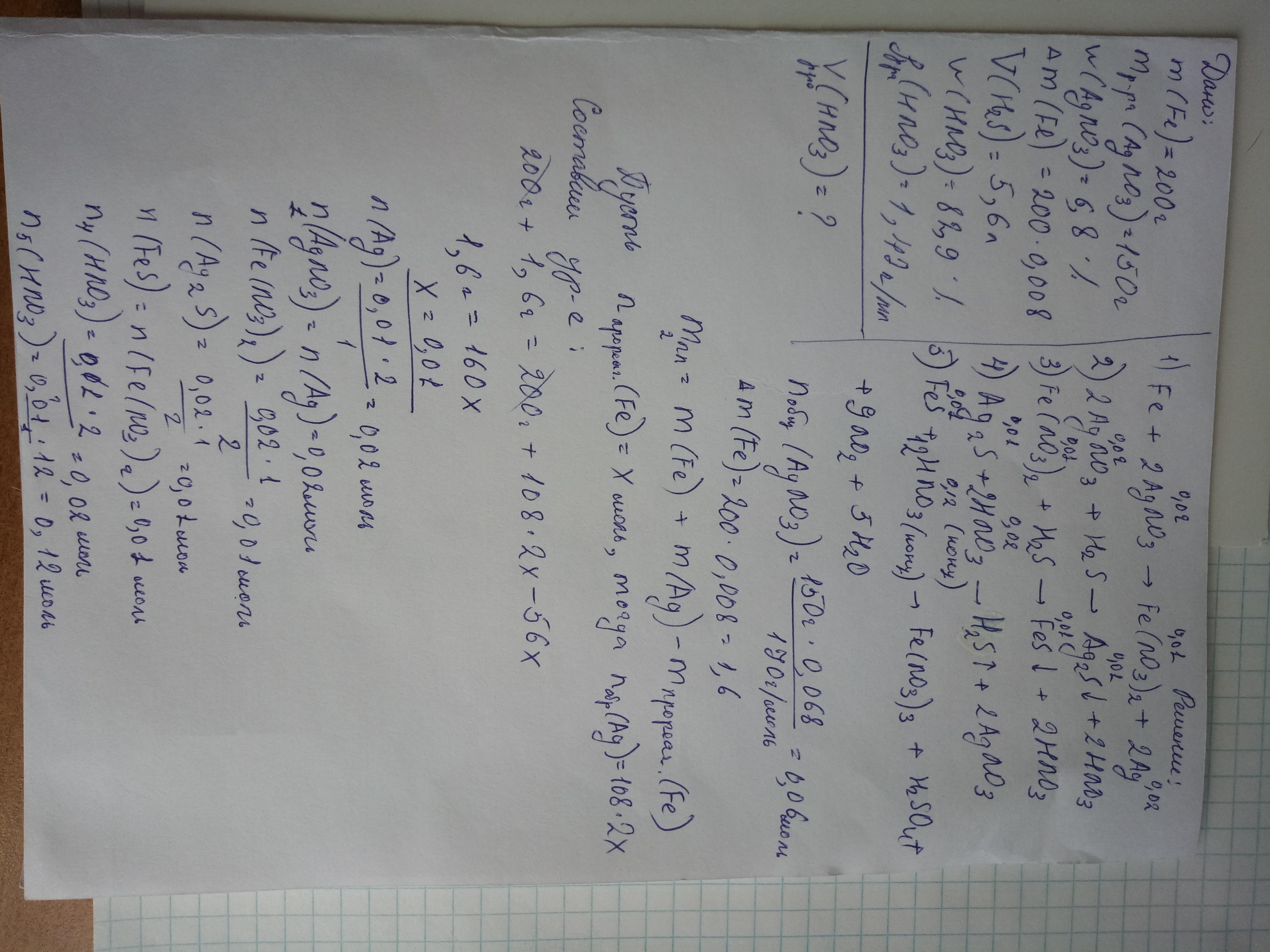 Железную пластинку массой 200г поместили в 150г 6,8%-го раствора нитрата серебра. Через некоторое время пластинку достали, промыли водой, высушили и взвесили, ее масса увеличилась на 0,8% . Через раствор пропустили 5,6 л (н.у) сероводорода. Рассчитайте объем горячего 82,9%-ного раствора азотной кислоты (плотность раствора 1,47 г/мл), который потребуется для растворения образовавшегося осадка.