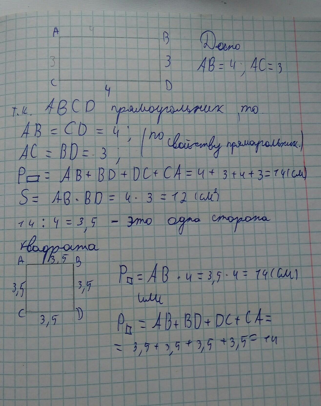 Надо будет начертить прямоугольник со сторонами 4 и 3 см найти площадь и периметр и начертить квадрат с таким же периметр ом