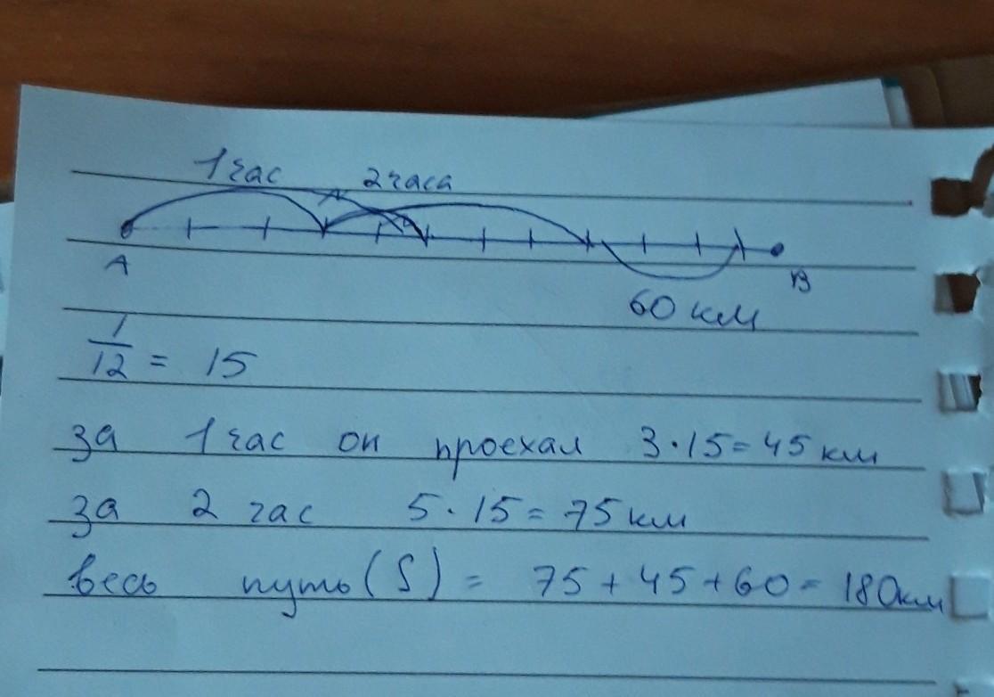 Помогите пожалуйста дам 30 баллов слушайте пассажирский поезд в первый час пришел 3/12 всего пути во второй час 5/12 всего пути а в третий остальные 60 км чему равен чему равен весь его путь сколько километров он прошел за второй час