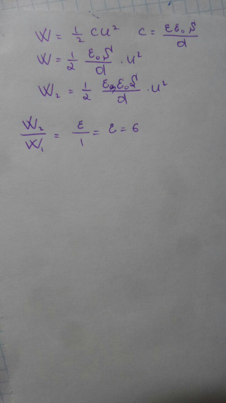 Плоский воздушный конденсатор (ε = 1) зарядили и отключили от источника напряжения. Если между обкладками поместить слюду (ε = 6), то энергия, запасённая в конденсаторе: