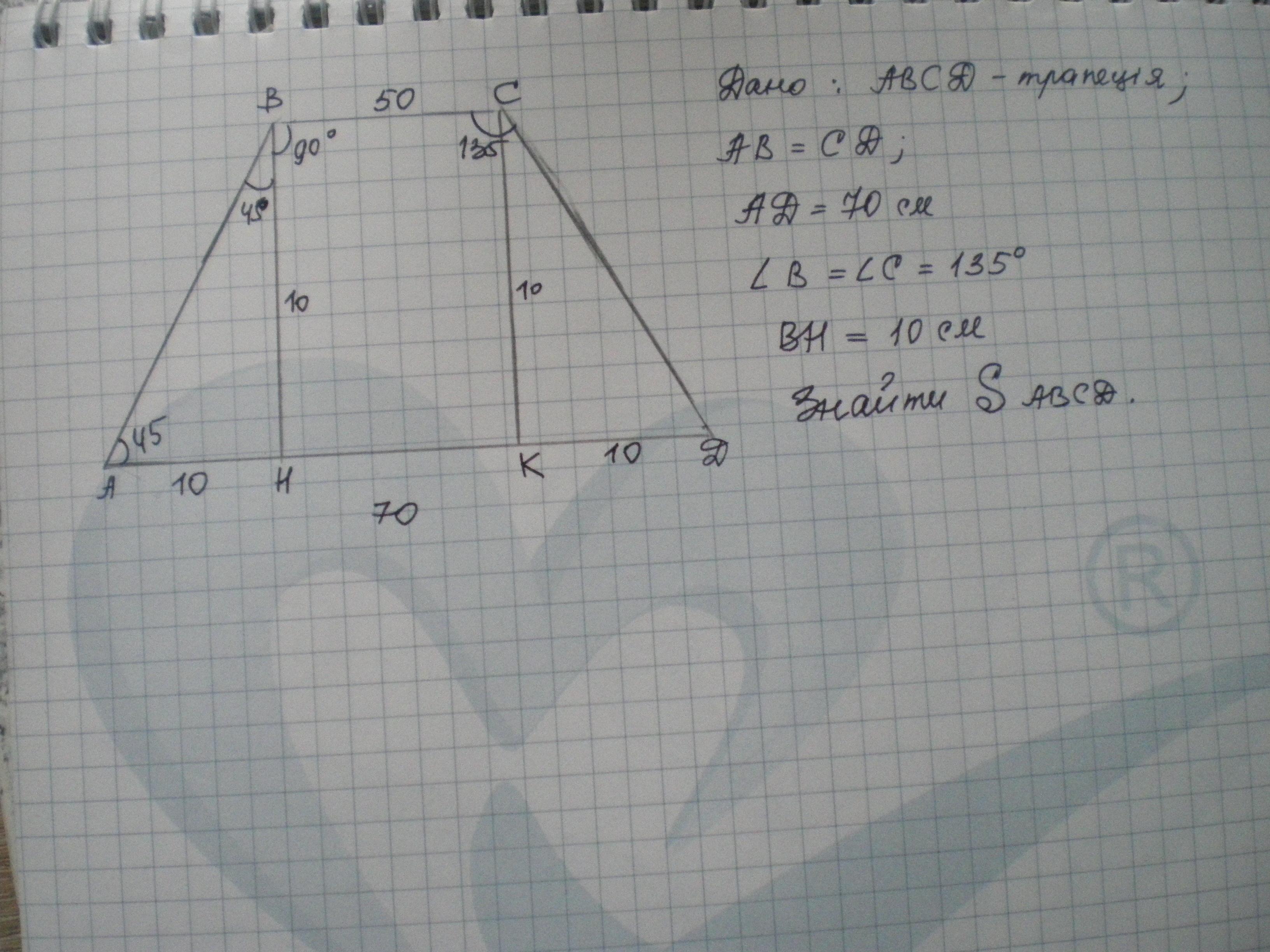 у рівнобічній трапеції більша основа дорівнює 70 см. один із кутів 135° , висота 10см. знайти прлощу трапеції дужн екстрено допоможіть бутьласка