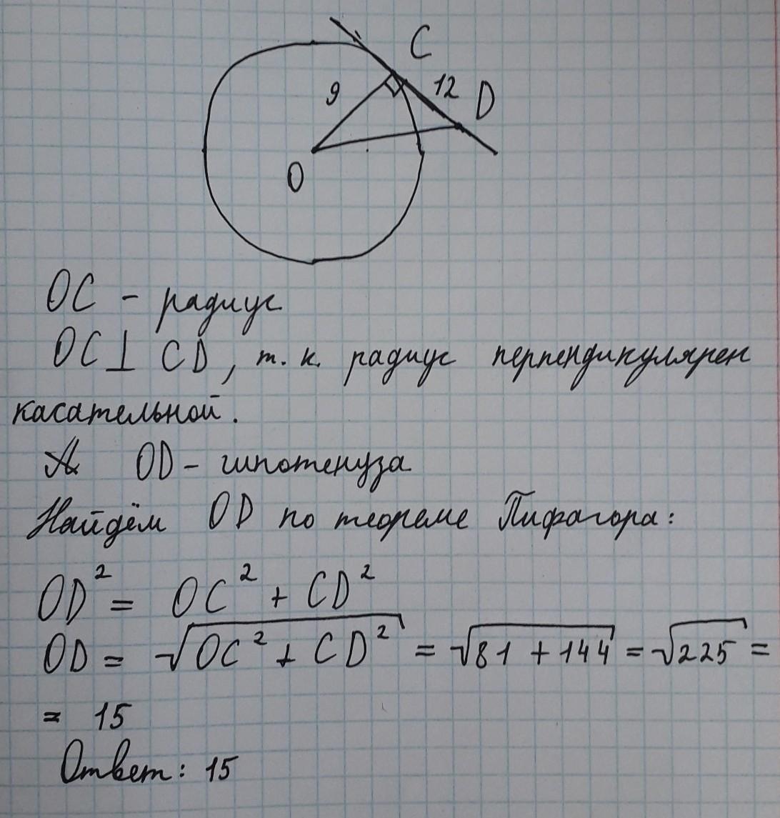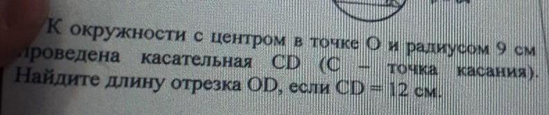 К окружности с центром в точке О и радиусом 9 см проведена касательная СD (С - точка касания). Найдите длину отрезка ОD, если CD=12см