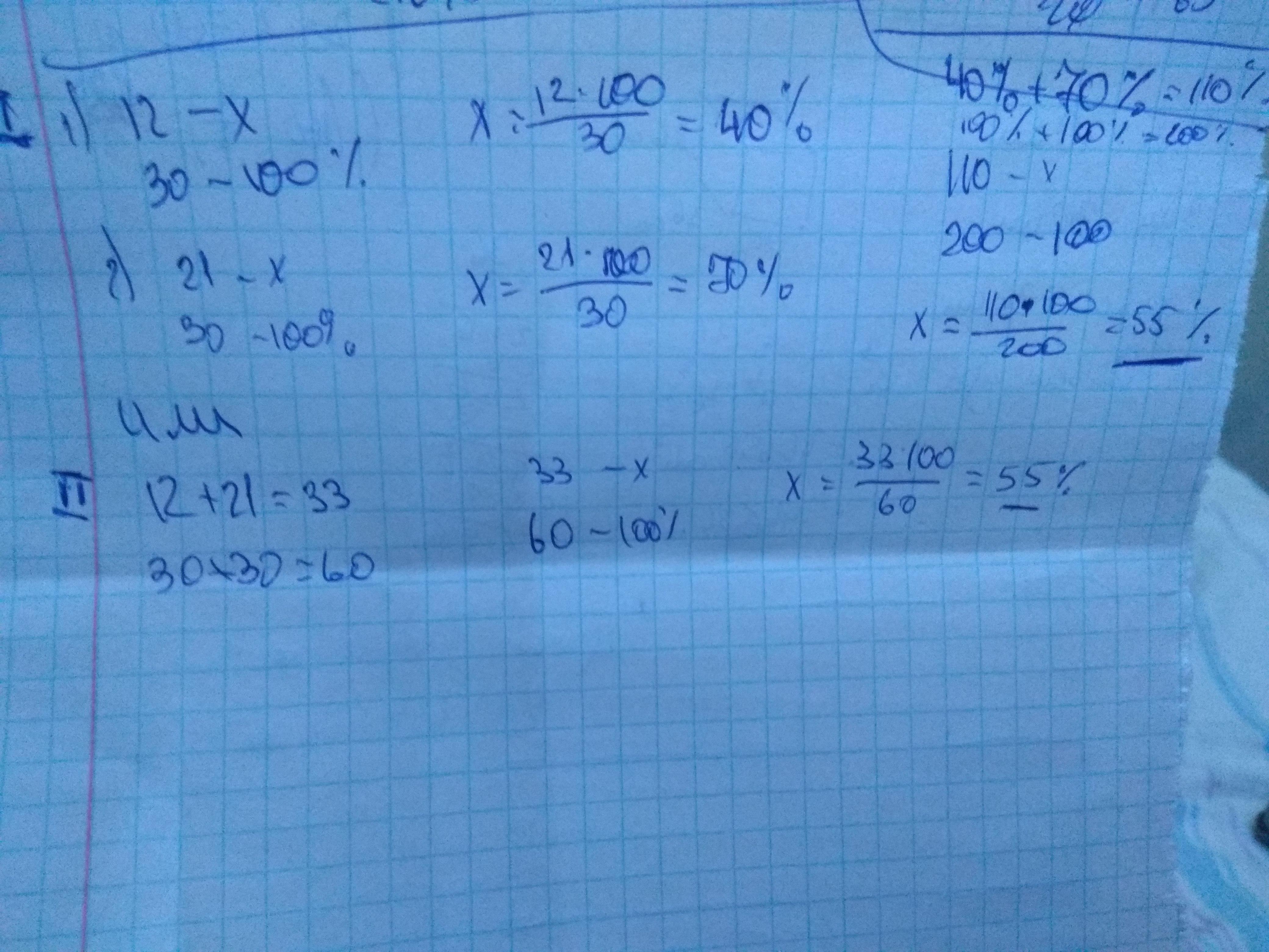 на первый вопрос ответило 12 из 30 людей на второй 21 из 30. Каков общий процент правильных ответов?
