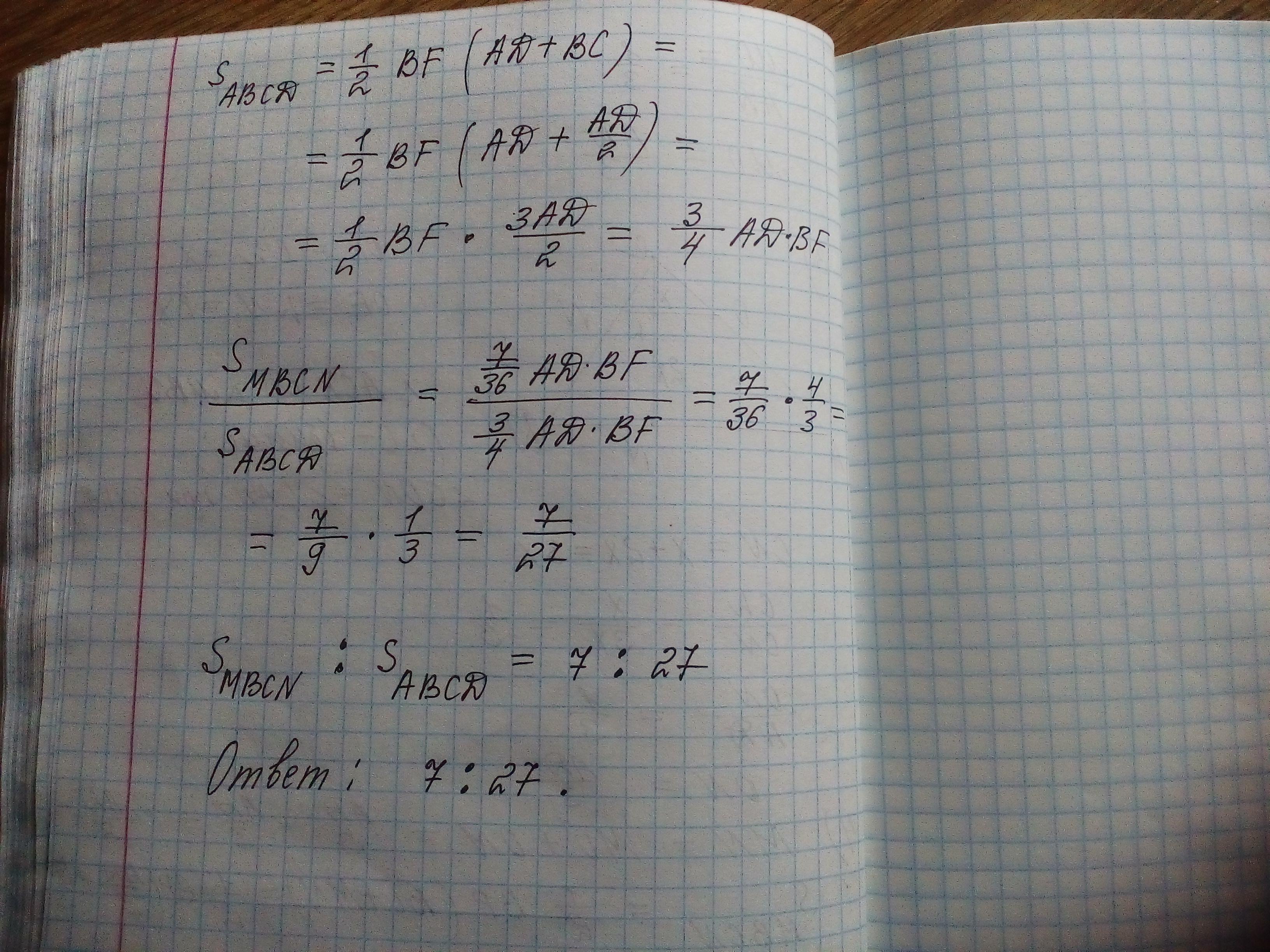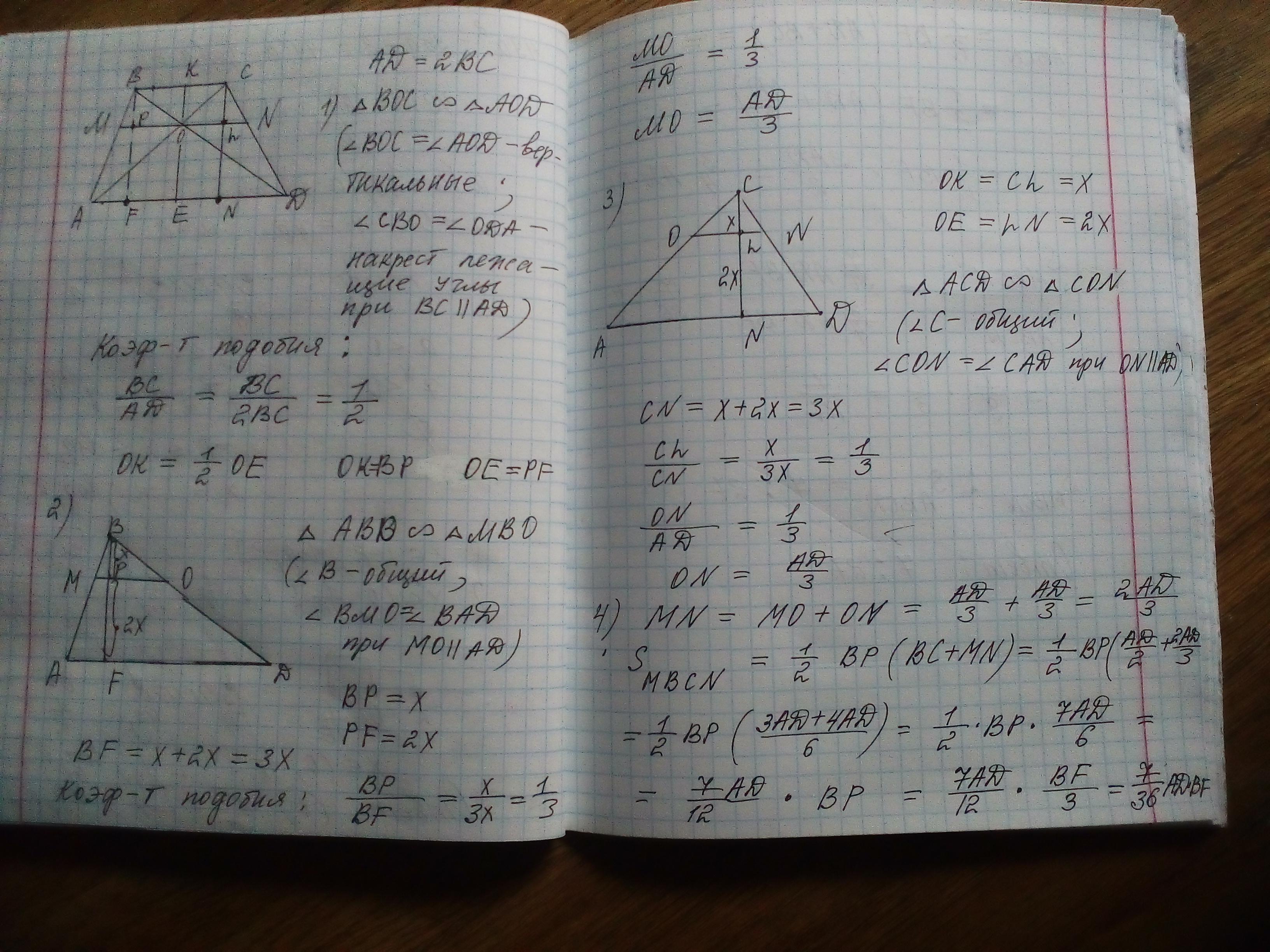 В трапеции АВСD точки M и N лежат на боковых сторонах АВ и СD. Прямая MN параллельна основаниям и проходит через точку пересечения диагоналей трапеции. Найти, в каком отношении отрезок MN делит площадь трапеции АВСD, если AD=2BC .
