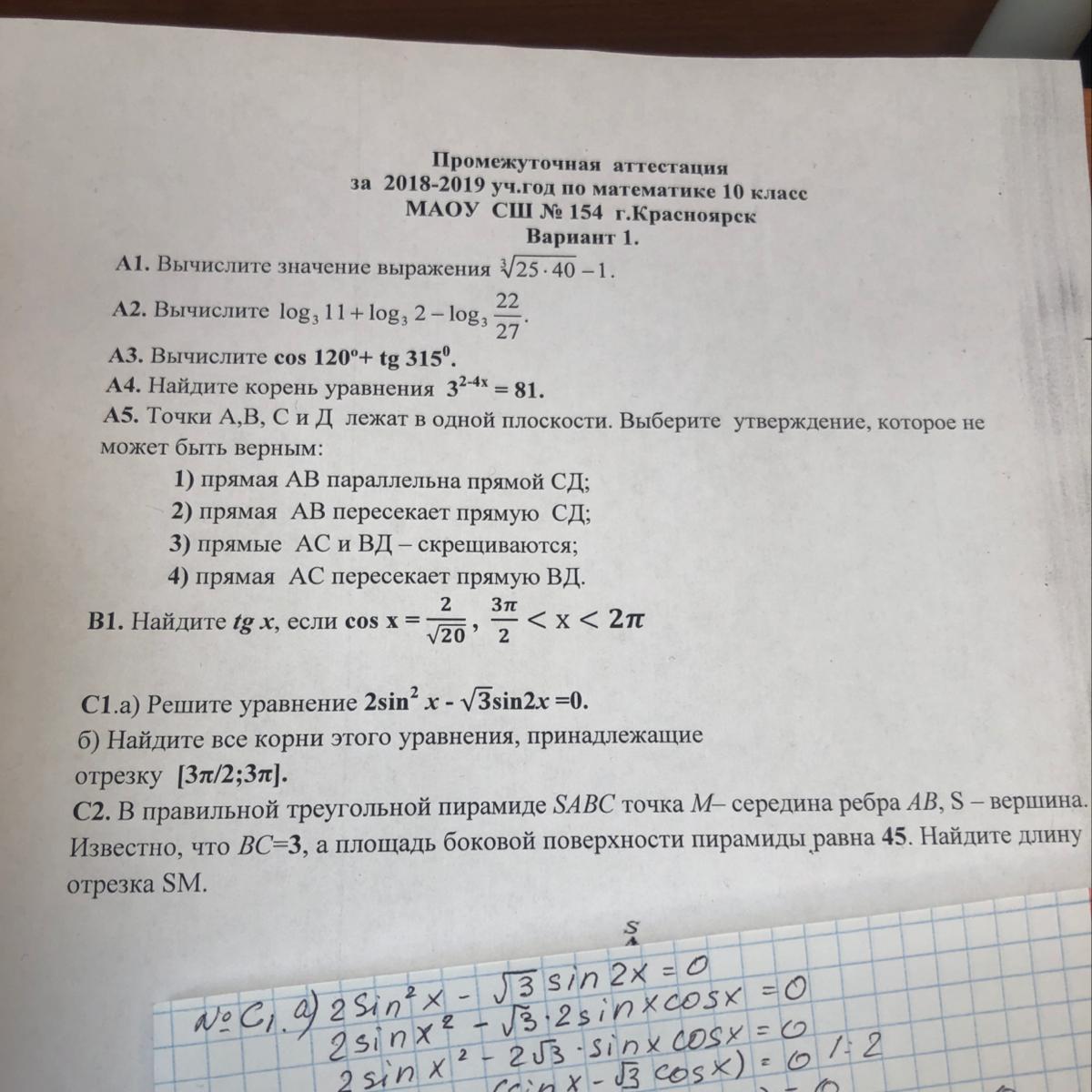 B1.; ; ; cosx=frac{2}{sqrt{20}}\\1+tg^2x=frac{1}{cos^2x}; ; Rightarrow ; ; tg^2x=frac{1}{cos^2x}-1=(frac{sqrt{20}}{2})^2-1=frac{20-4}{4}=frac{16}{4}=4\\frac{3pi }{2}<x<2pi ; ; ; to ; ; ; tgx<0\\tgx=-sqrt{4}=-2\\\C1; ; .; ; ; 2sin^2x-sqrt3, sin2x=0; ; ; qquad (sin^2x=(sinx)^2ne sinx^2=sin(x^2))\\2sin^2x-sqrt3cdot 2, sinxcdot cosx=0\\2, sinxcdot (sinx-sqrt3, cosx)=0\\a); ; sinx=0; ; ,; ; x=pi n; ,; nin Z\\b); ; sinx-sqrt3, cosx=0; |:cosxne 0