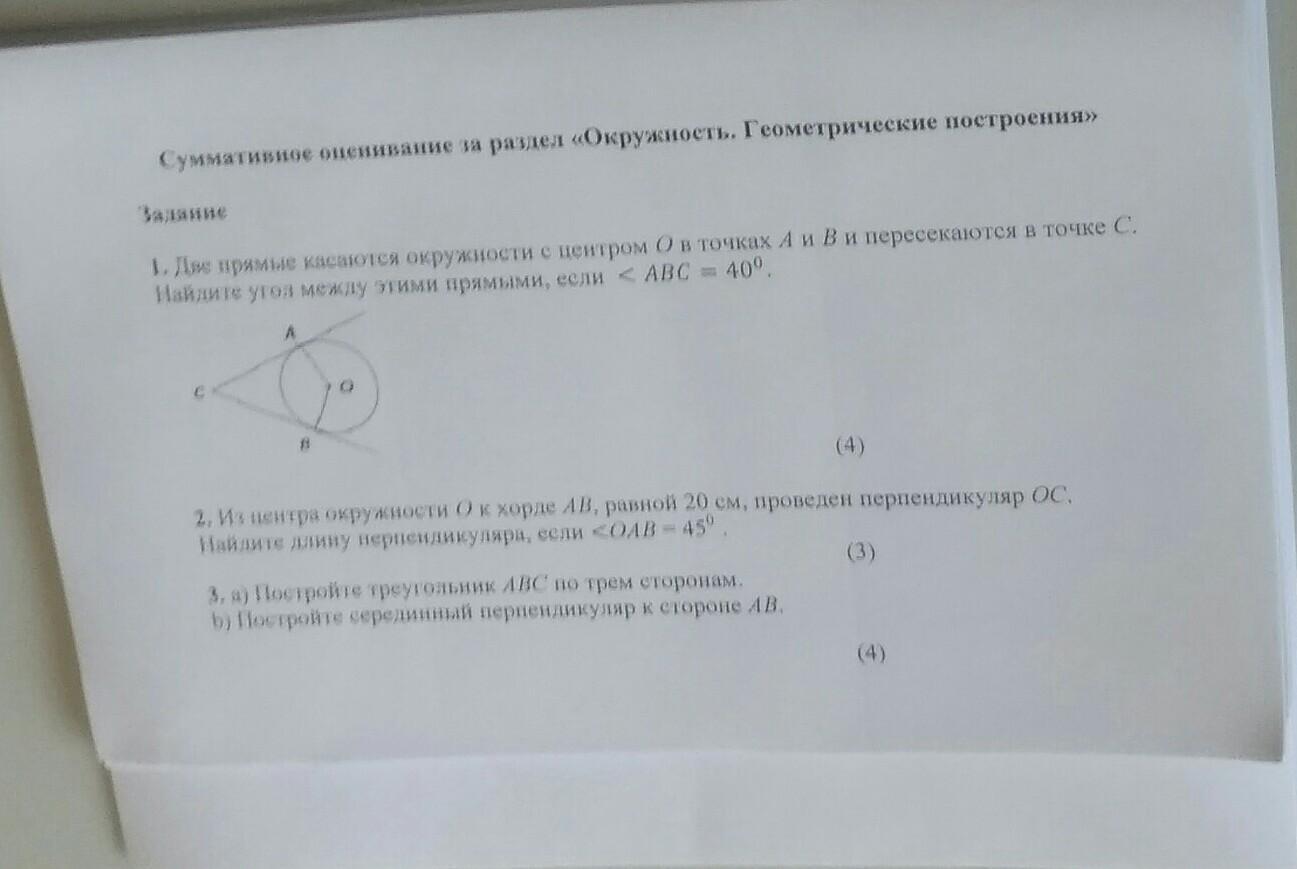 Две прямые касаются окружности с центром О в точках А и В и пересекаются в точке С. Найдите угол между этими прямыми, если угол АВС = 40 градусам. (+ рисунок на фото)