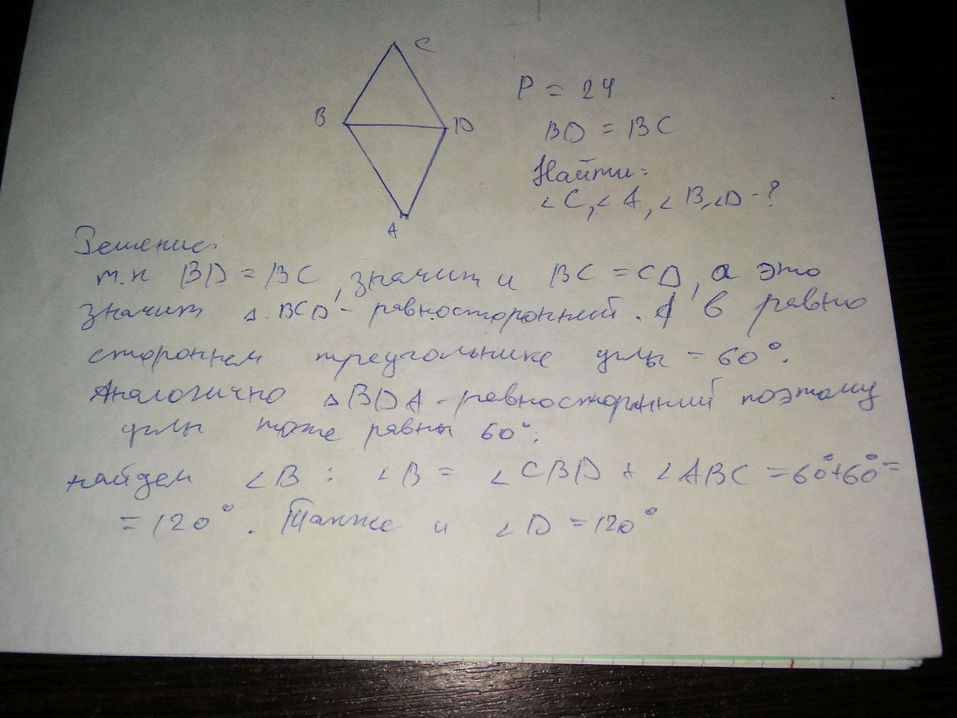 Периметр ромба равен 24см. Меньшая диагональ ромба равна его стороне. Найдите углы ромба. (с рисунком)