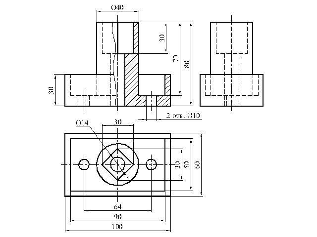 На главном виде сделала фронтальный разрез, т.к. размеры не проставляют по невидимым линиям.