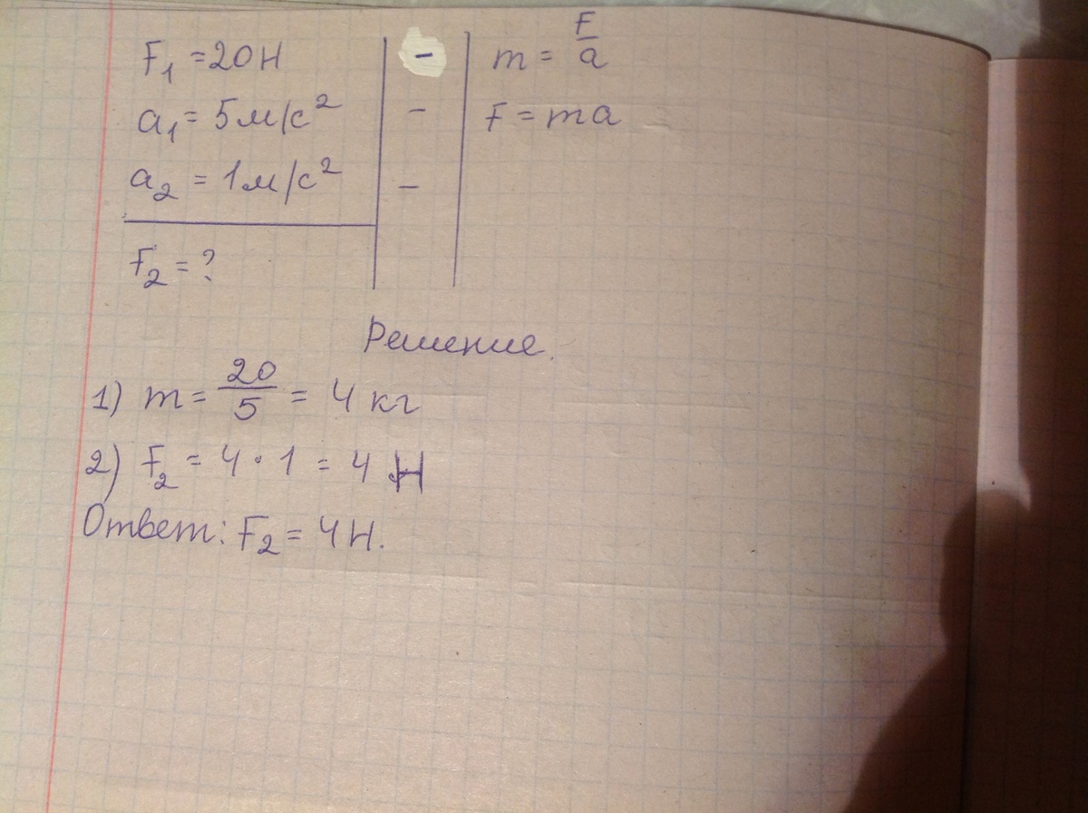 Если под действием силы F1=20Н тело движется с ускорением а1=5м,с2,то какую силу надо приложить к этому же телу,чтобы сообщить ему ускорение а2=1м,с2?