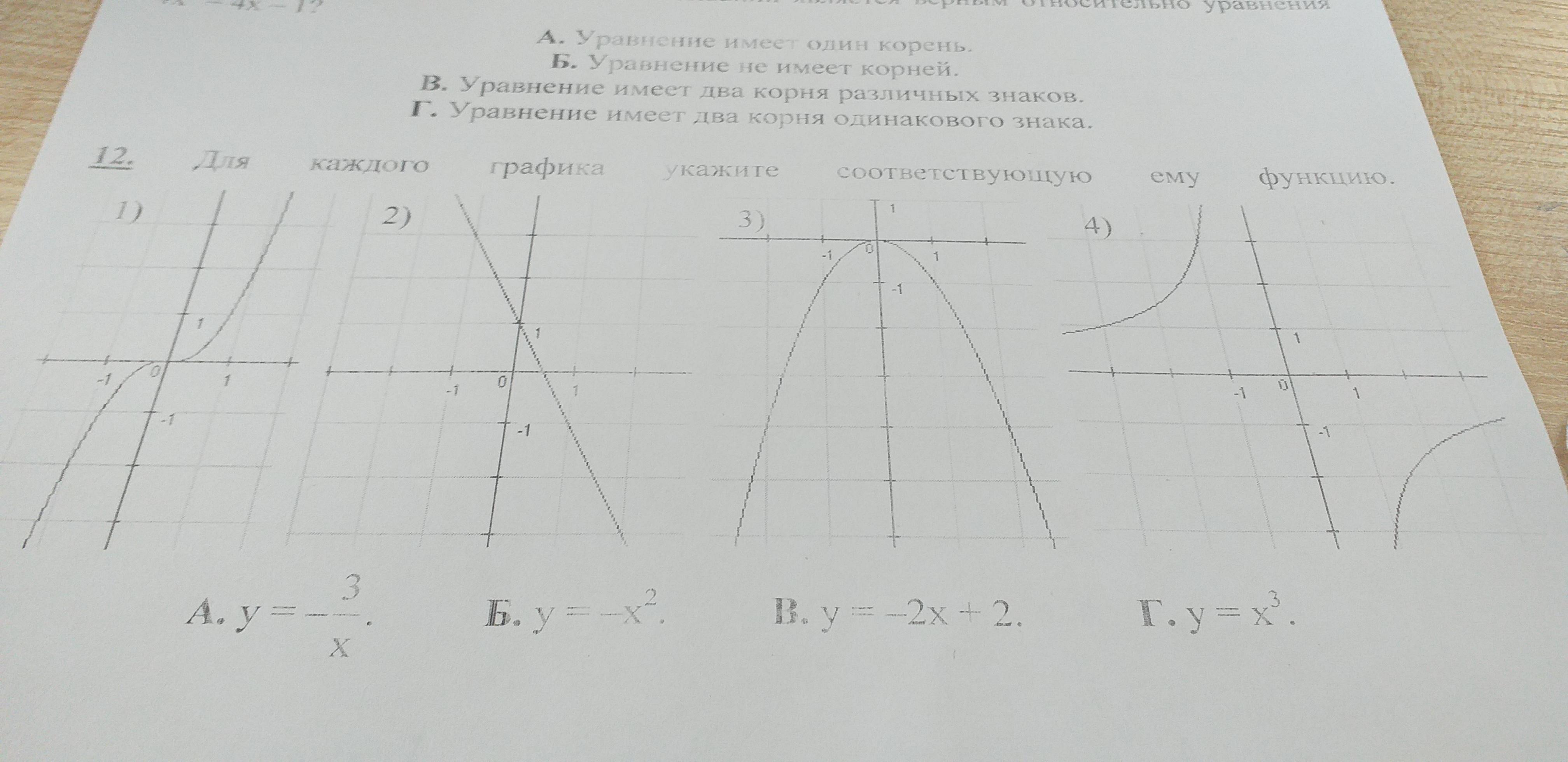 А) это гипербола, она имеет вид y= k/x; Б) это парабола она имеет вид y= ax^2+bx+c ; В) это прямая, она имеет вид y= kx+b; Г) это тоже гипербола, но она имеет другой вид функции y=x^3
