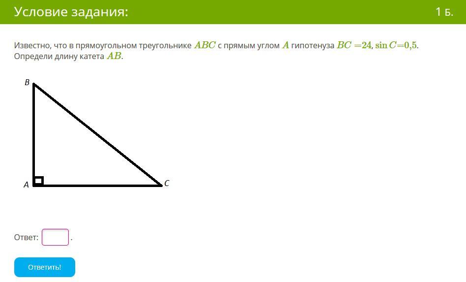 В первом ответ 12, т.к sin это отношение противолежащего катета к гипотенузе. Получается 0,5=AB/24 › AB=0,5*24 › AB=12