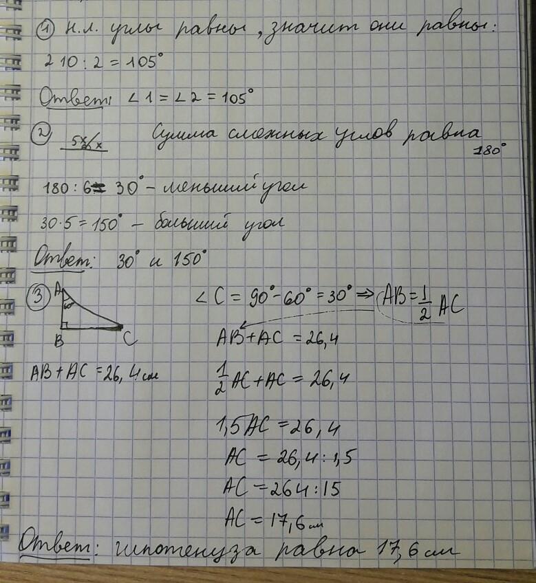 1) Сумма накрест лежащих углов при пересечении двух параллельных прямых секущей равна 210. Найти эти углы.
