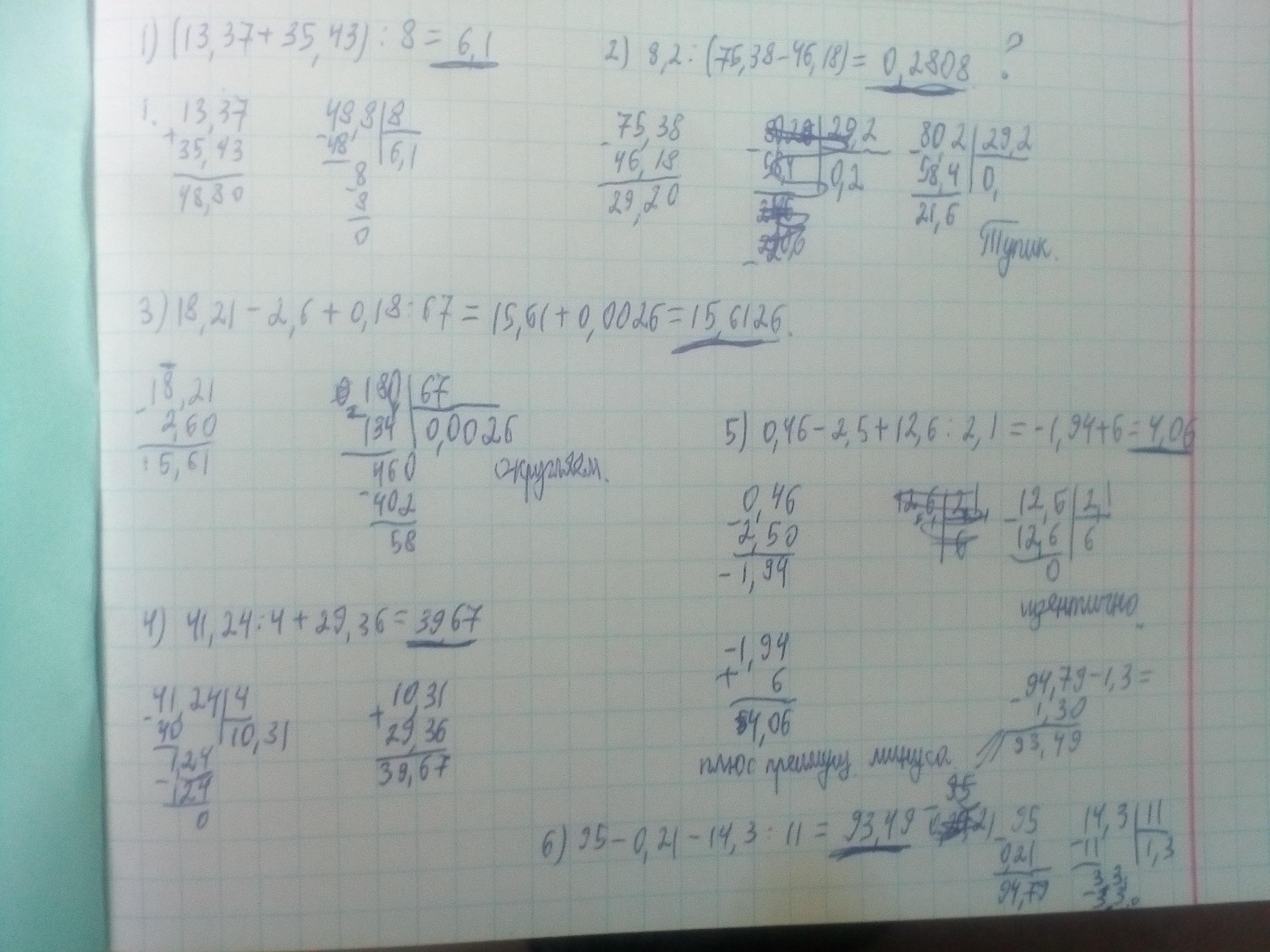 2) 8,2 : (75,38 – 46,18); 5) 0,46 - 2,5 + 12,6 : 2,1;