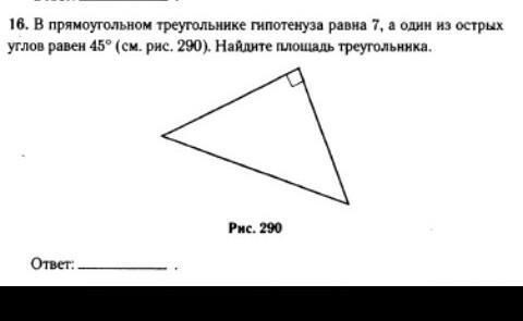 прямоугольном треугольнике гипотенуза равна 7 см а острый угол равен 45 градусам найдите площадь треугольника.