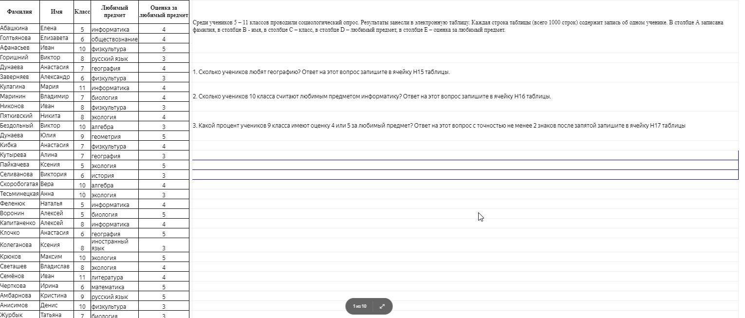 =СЧЁТЕСЛИМН(D2:D1001;"информатика";C2:C1001;10)