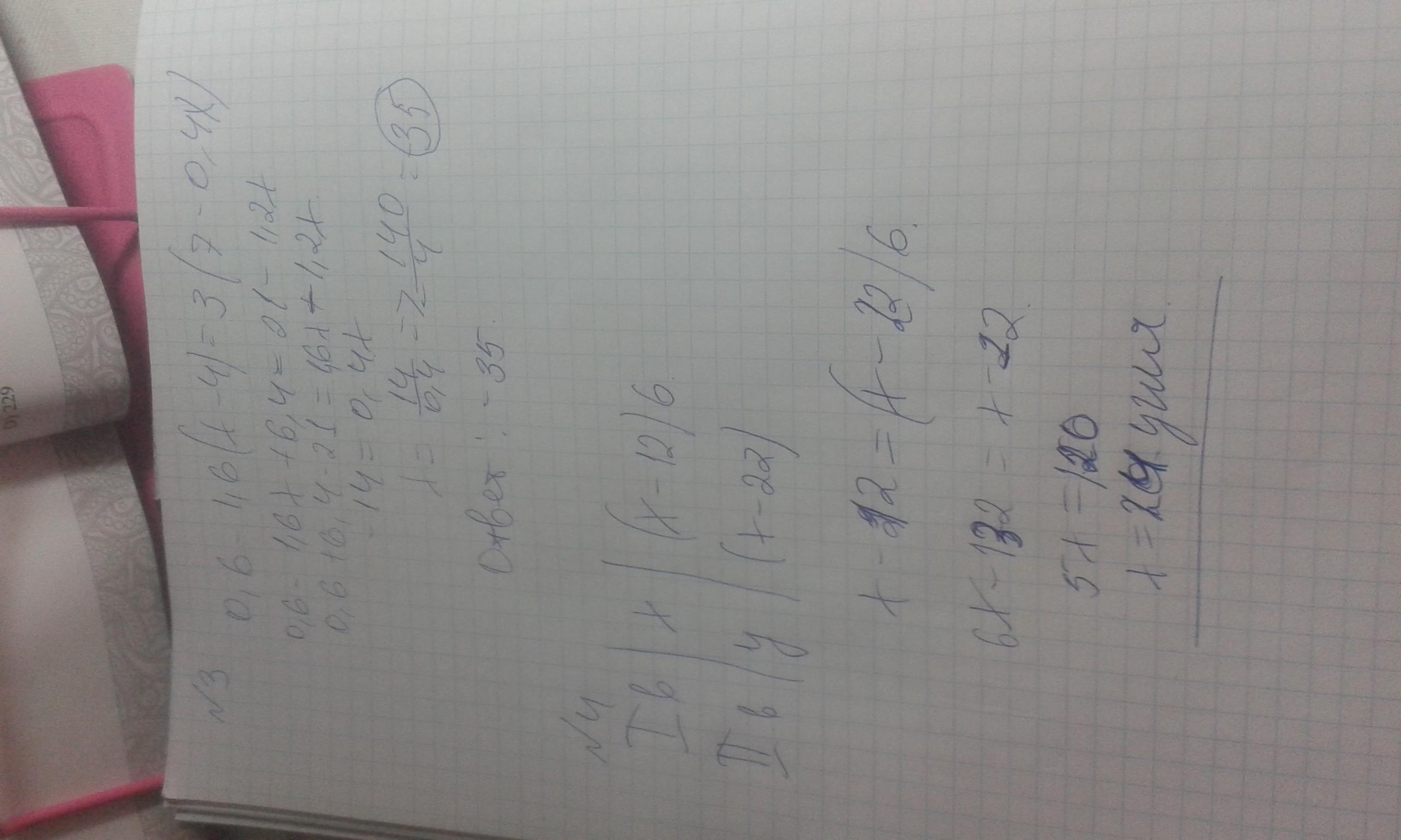 0,6 - 1,6(x - 4) = 3(7 - 0,4x)