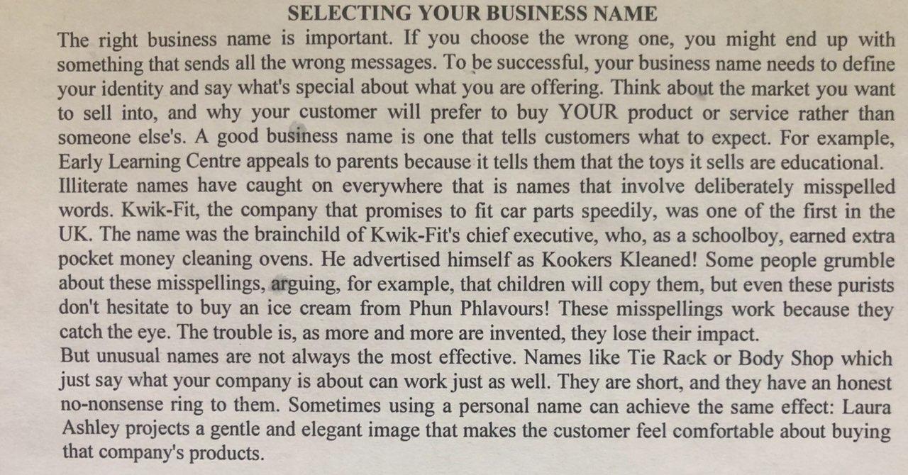 Правильное название бизнеса важно. Если вы выберете неправильный вы можете получить что то что отправляет неправильные сообщения. Чтобы быть успешным название вашего бизнеса должнно определять вашу личность и сказать что особенного в том что вы предлаггаете . Подумайте о рынке на который вы хотите продавать