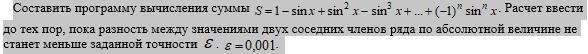 Составить программу вычисления суммы . Расчет ввести до тех пор, пока разность между значениями двух соседних членов ряда по абсолютной величине не станет меньше заданной точности . .