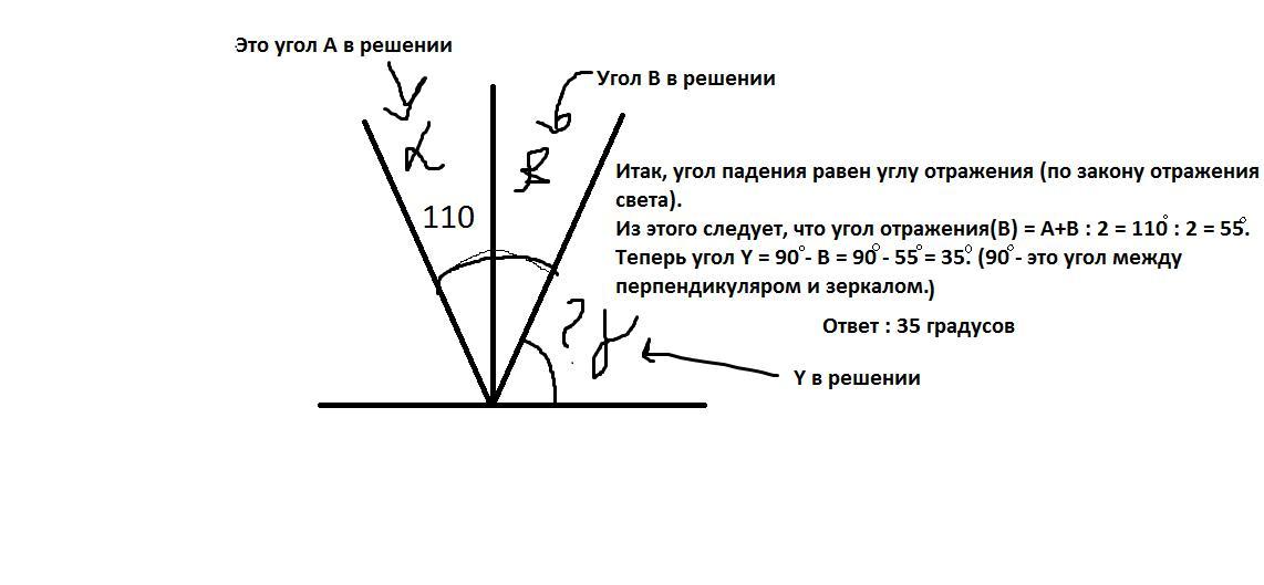 луч света падает на плоское зеркало. угол между падающим и отраженным лучами 110 градусов. Чему равен угол между зеркалом и отраженным лучом?