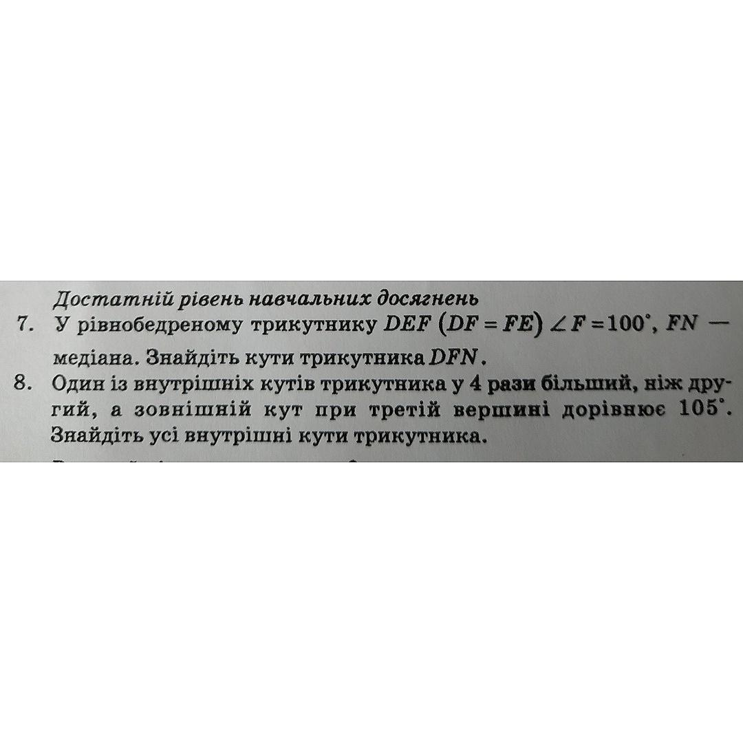 7. В равнобедренном треугольнике DEF (DF=FE) 8. Один из внутренних углов треугольника в 4 раза больше, чем второй, а внешний угол при третьей вершине равен 105". Найдите все внутренние углы треугольника..