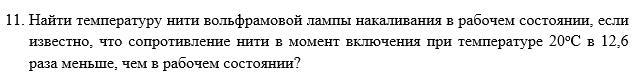 Зависимость R от температуры R(Траб)=R(20°)*[1+альфа* (Траб-20°)], R(Траб)/ R(20°)-1= альфа*(Траб-20°)=11.6 из условия. Для вольфрама ТКС альфа=4.6*10^-3 [1/°С] относительно R(20°С). Тогда
