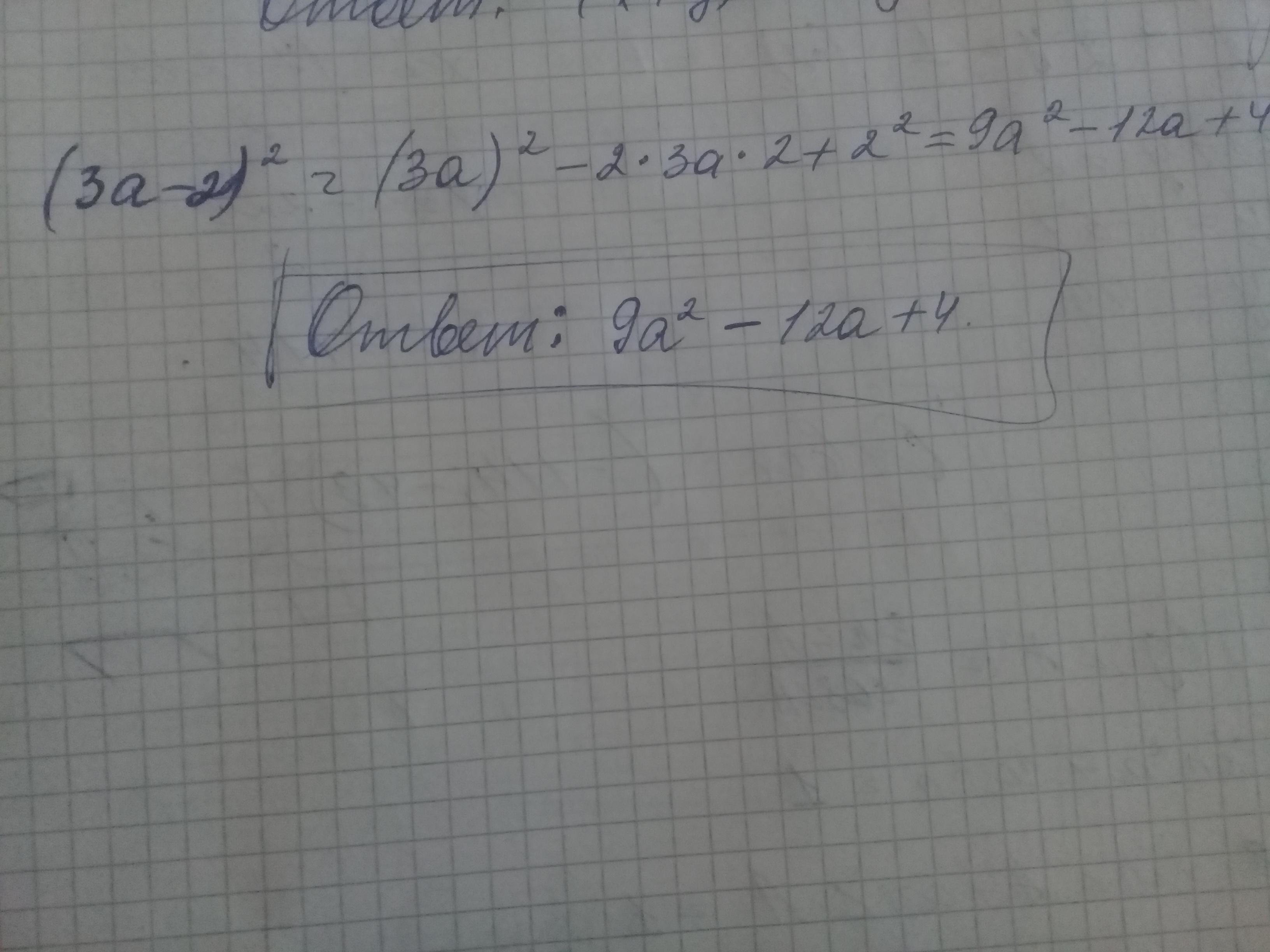 (3а-2)²= (3а)²-2*3а*2+2²=9а²-12а+2²=9а²-12а+4