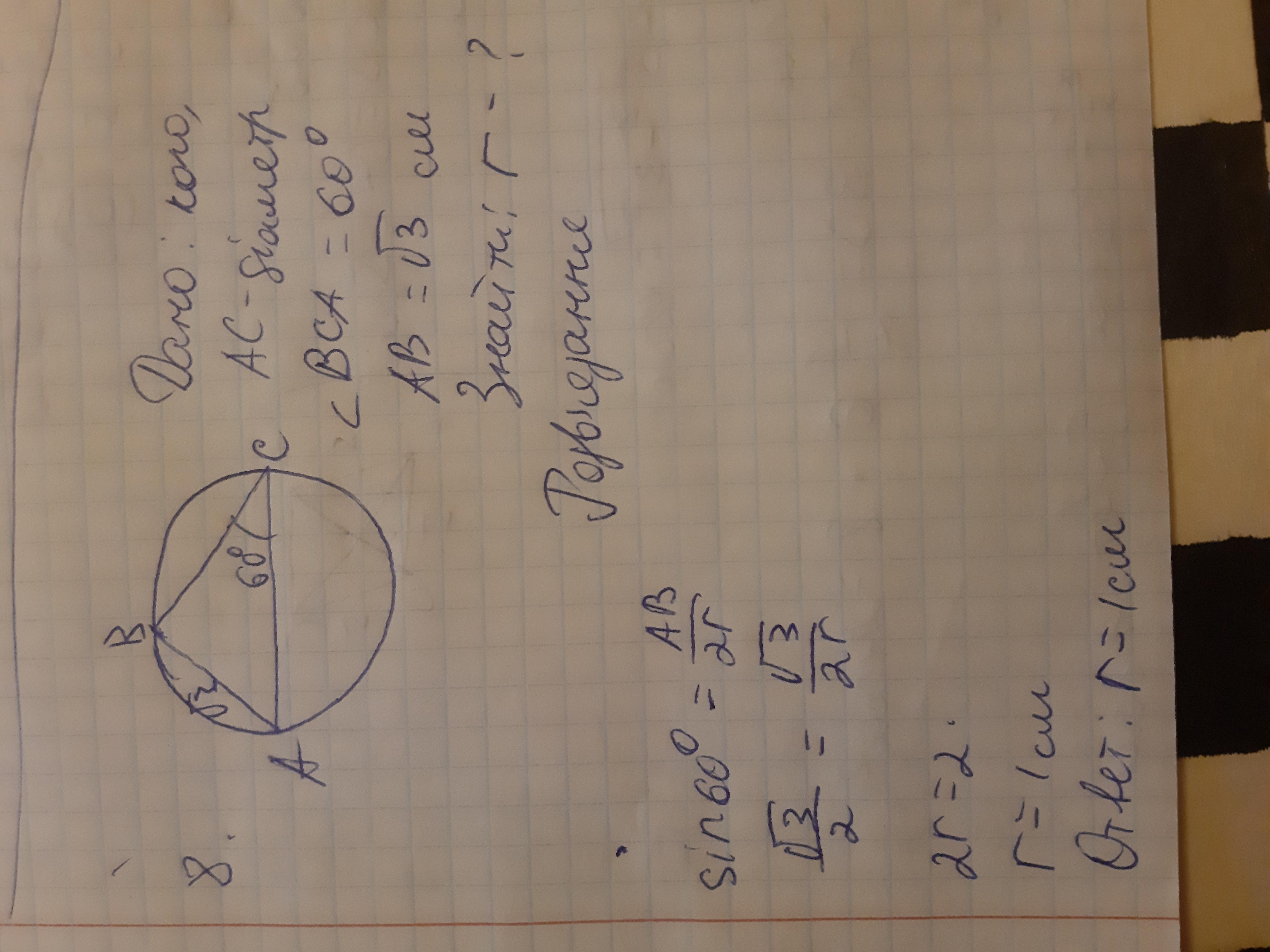 на колі позначено точки A, B, C так що AC-діаметр кола,хорду ВC видно з центра кола під кутом 60°.знайдіть радіус кола якщо AB= √3см