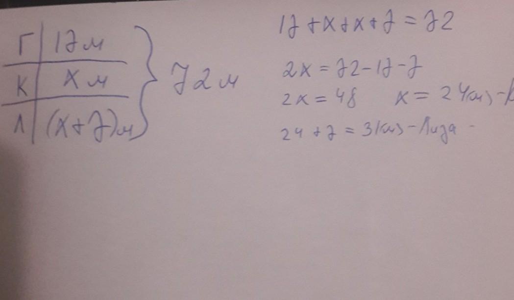 В соревнованиях по метанию мяча участвовали команда из 3 человек. Результаты всех участников команды складывались вместе. Общая сумма бросков Гали, Лизы и Кати составила 72 метра. Лиза метнула мяч на 7 метров дальше, чем Катя. Как далеко метнула каждая из девочек, если мяч Гали улетел на 17 метров?