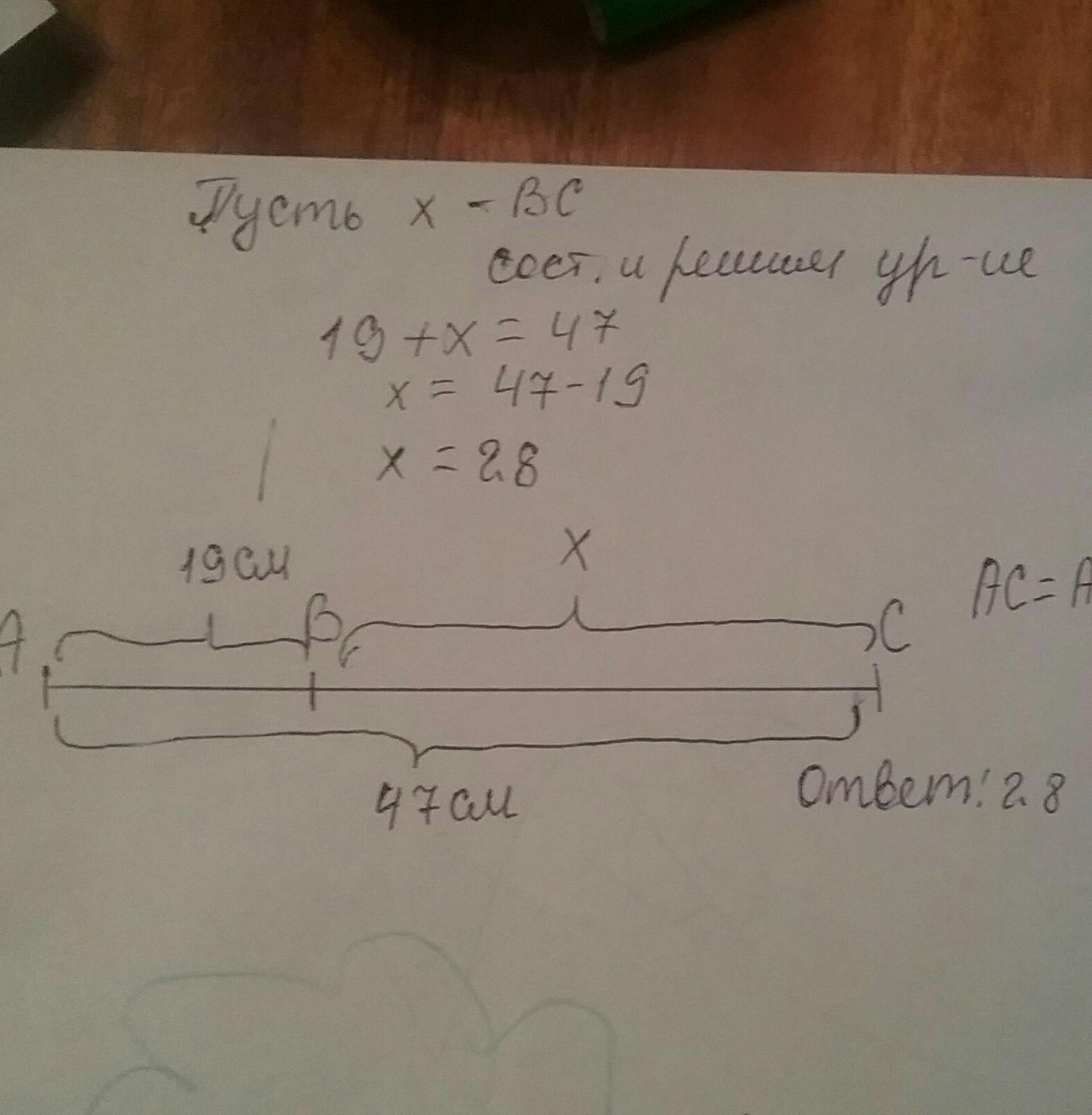 Решение: АС=АВ+ВС ВС=АС-АВ ВС=47-19=28 см.