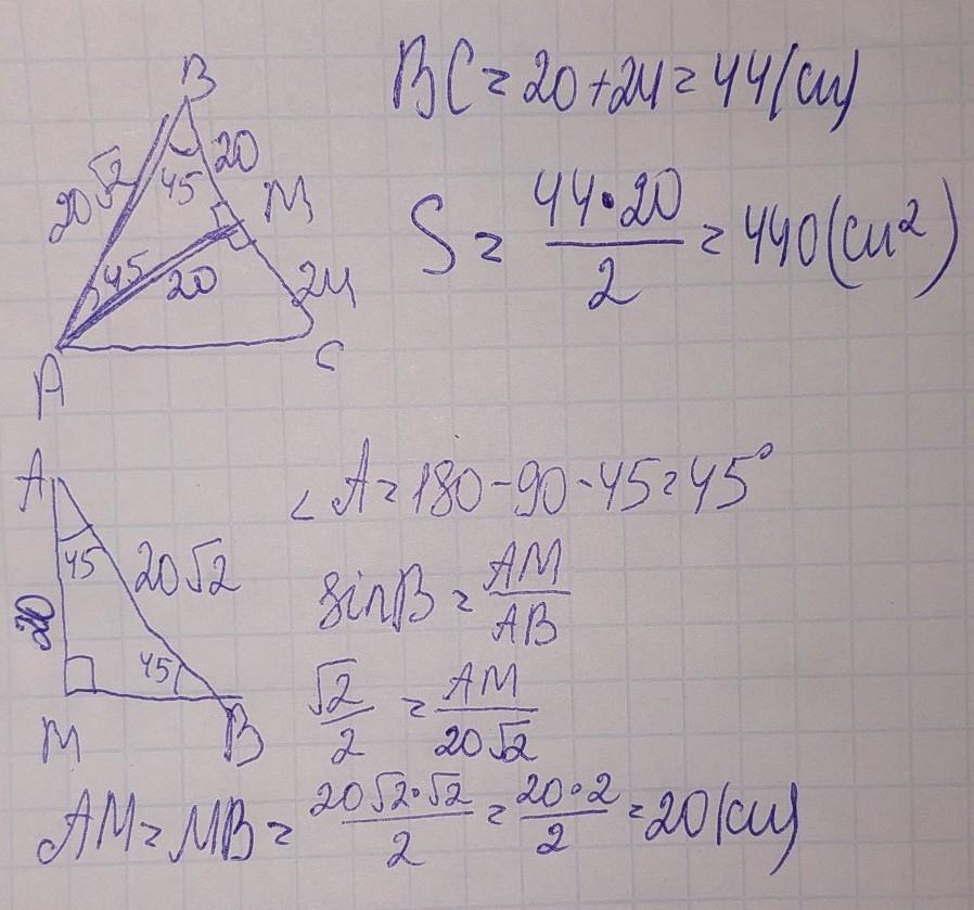 Висота AM трикутника ABC ділить його сторону BC на відрізки BM і MC. Знайдіть площу трикутника ABC, якщо AB=20√2 см, MC=24см, кут B=45°