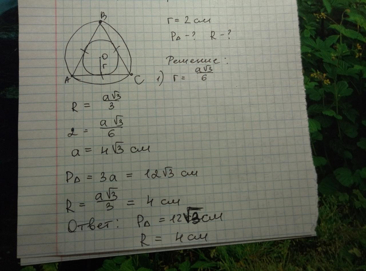треугольник окружности равен 2 см. Найдите периметр треугольника и радиус описанной окружности.